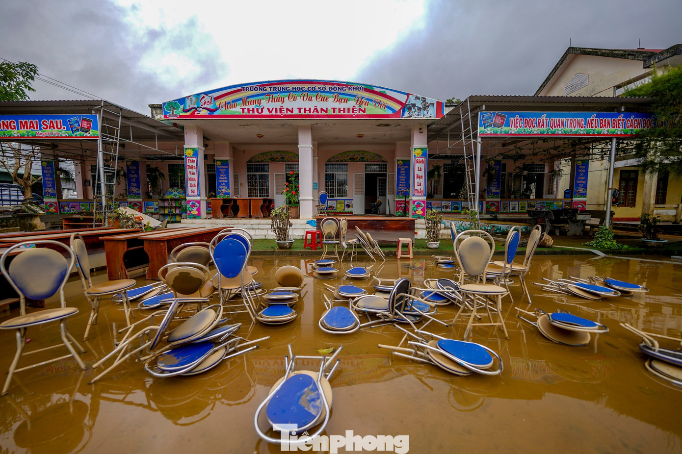 Những ngày qua, mưa lũ gây ngập úng hầu hết các trường học ở xã Hòa Thịnh, tỉnh Đắk Lắk (Phú Yên), toàn bộ trang thiết bị dạy học, sách vở, bàn ghế đều bị hư hỏng nặng. Tại trường THCS Đồng Khởi, nhiều lớp học bị bùn phủ dày gần 20 cm, bàn ghế nổi váng nước, sân trường ngổn ngang trận lũ lớn.