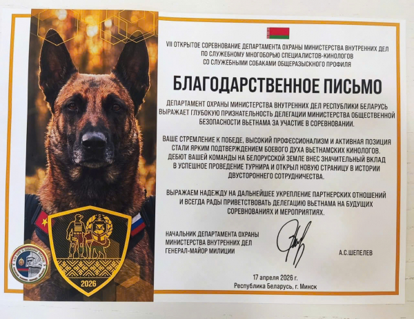 Từ ngày 15 đến 17/4, tại Belarus, Đoàn công tác của Trung tâm Huấn luyện và sử dụng động vật nghiệp vụ (Bộ Tư lệnh Cảnh sát cơ động, Bộ Công an) đã để lại dấu ấn đậm nét tại Cuộc thi mở lần thứ VII về thể thao đa năng nghiệp vụ dành cho các chuyên gia huấn luyện chó nghiệp vụ. Lần đầu tiên tham gia với tư cách đội tuyển chính thức, các cán bộ huấn luyện và chó nghiệp vụ Việt Nam đã thi đấu tự tin, bản lĩnh, xuất sắc giành giải Ba toàn đoàn ở 7 nội dung, từ huấn luyện tổng quát đến theo dõi trong môi trường đô thị, rừng, tìm kiếm đồ vật và vượt chướng ngại vật.