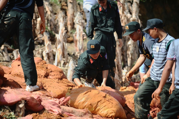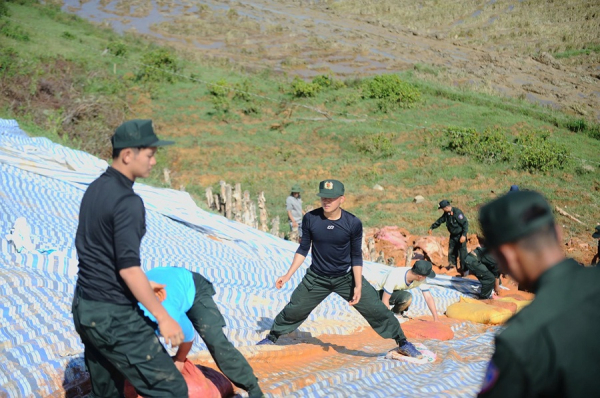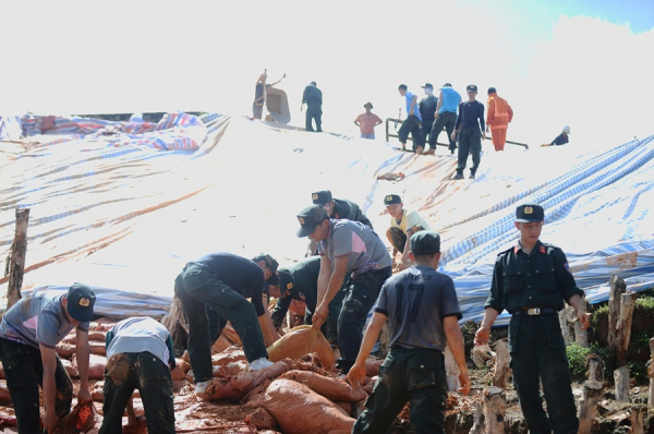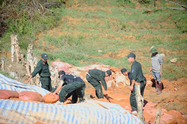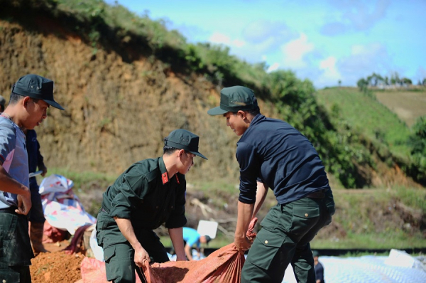Cùng với các lực lượng khác, CBCS Phòng Cảnh sát Cơ động Công an tỉnh Lâm Đồng đã cấp tốc đào đất, di chuyển tới gia cố chân đập và những vị trí xảy ra nứt trượt đất.
