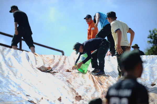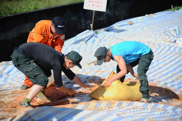 Từ sáng 8/11 tới nay, trời đã ngừng mưa, chuyển sang nắng gắt. Hàng chục CBCS mồ hôi nhễ nhại, quần áo bê bết bùn đất vẫn tiếp tục phối hợp với các lực lượng chức năng gia cố hồ đập, nhằm đảm bảo an toàn tính mạng và tài sản của nhân dân vùng hạ du.