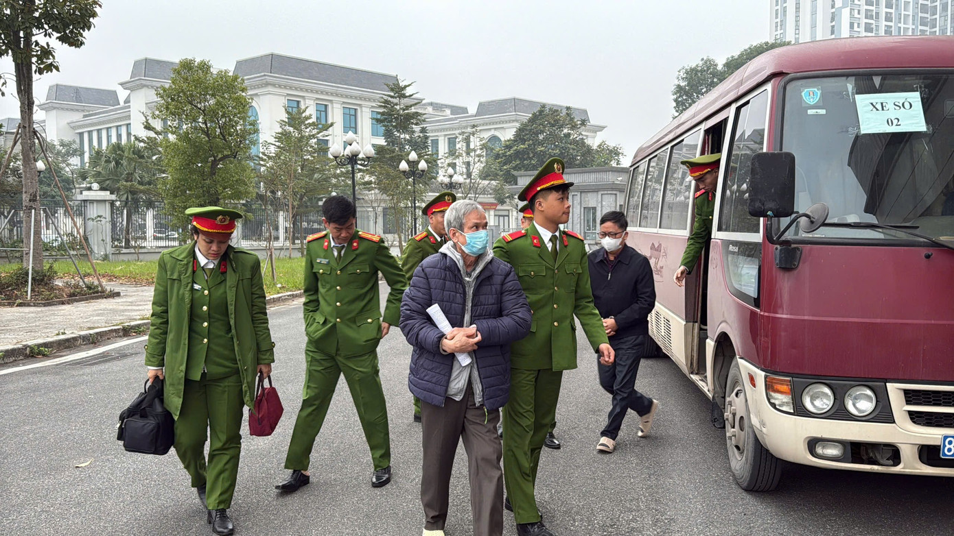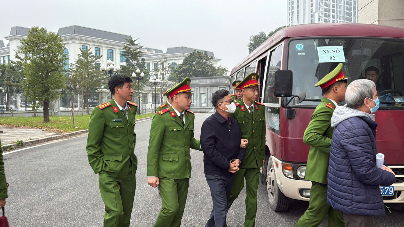 Khoảng 7h30 ngày 26/1, cảnh sát dẫn giải nhóm bị cáo phạm tội trong vụ án xảy ra tại Tổng công ty Xi Măng Việt Nam (VICEM) đến trụ sở TAND TP Hà Nội, phục vụ công tác xét xử.