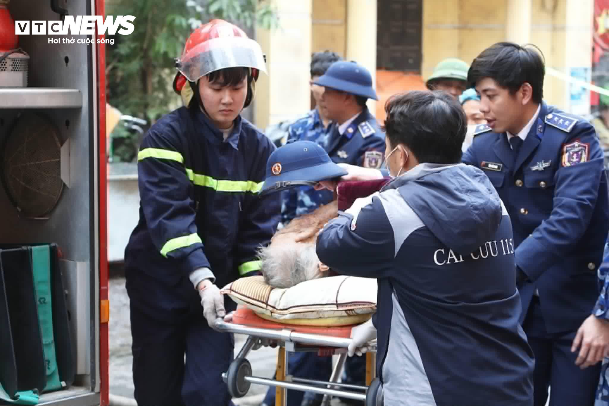 Một nạn nhân lớn tuổi mắc kẹt trong đám cháy được đưa ra khỏi hiện trường, chuyển tới bệnh viện.