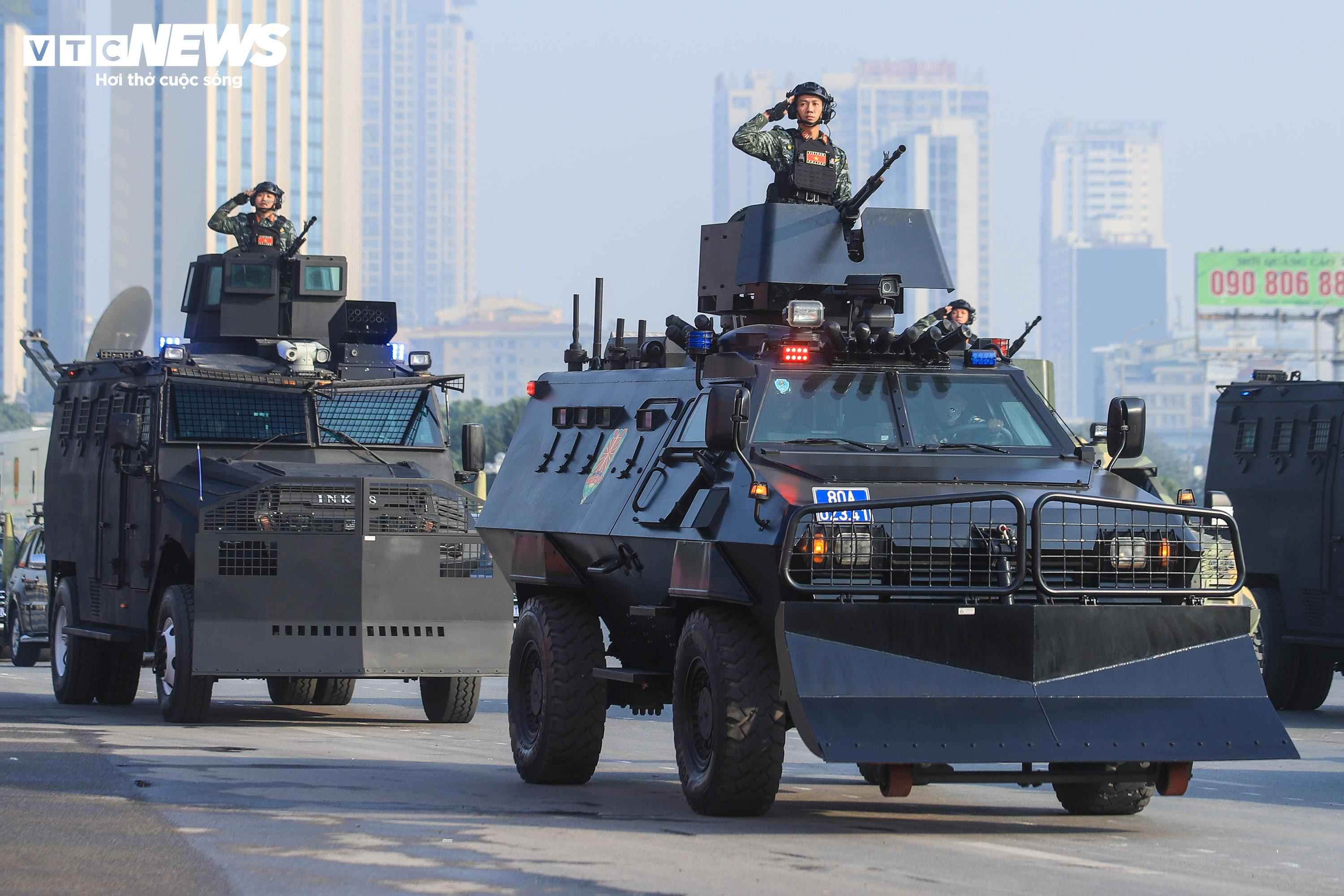 Đi sau là đội hình khí tài hiện đại gồm các loại xe đặc chủng, xe bọc thép phục vụ nhiệm vụ chống khủng bố, phòng chống bạo loạn. Đây là những phương tiện hiện đại nhất của lực lượng Công an, được huy động nhằm bảo đảm an ninh, an toàn xuyên suốt kỳ Đại hội.