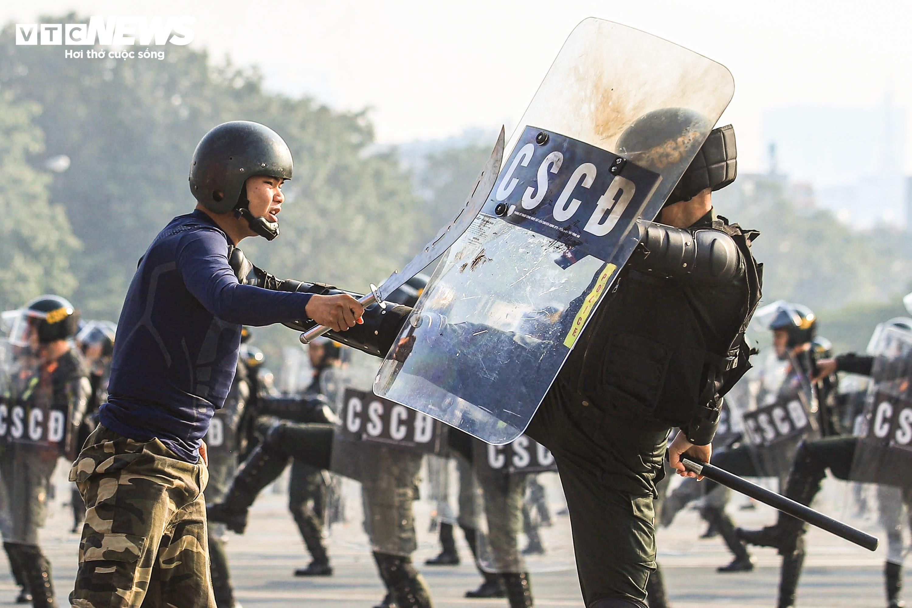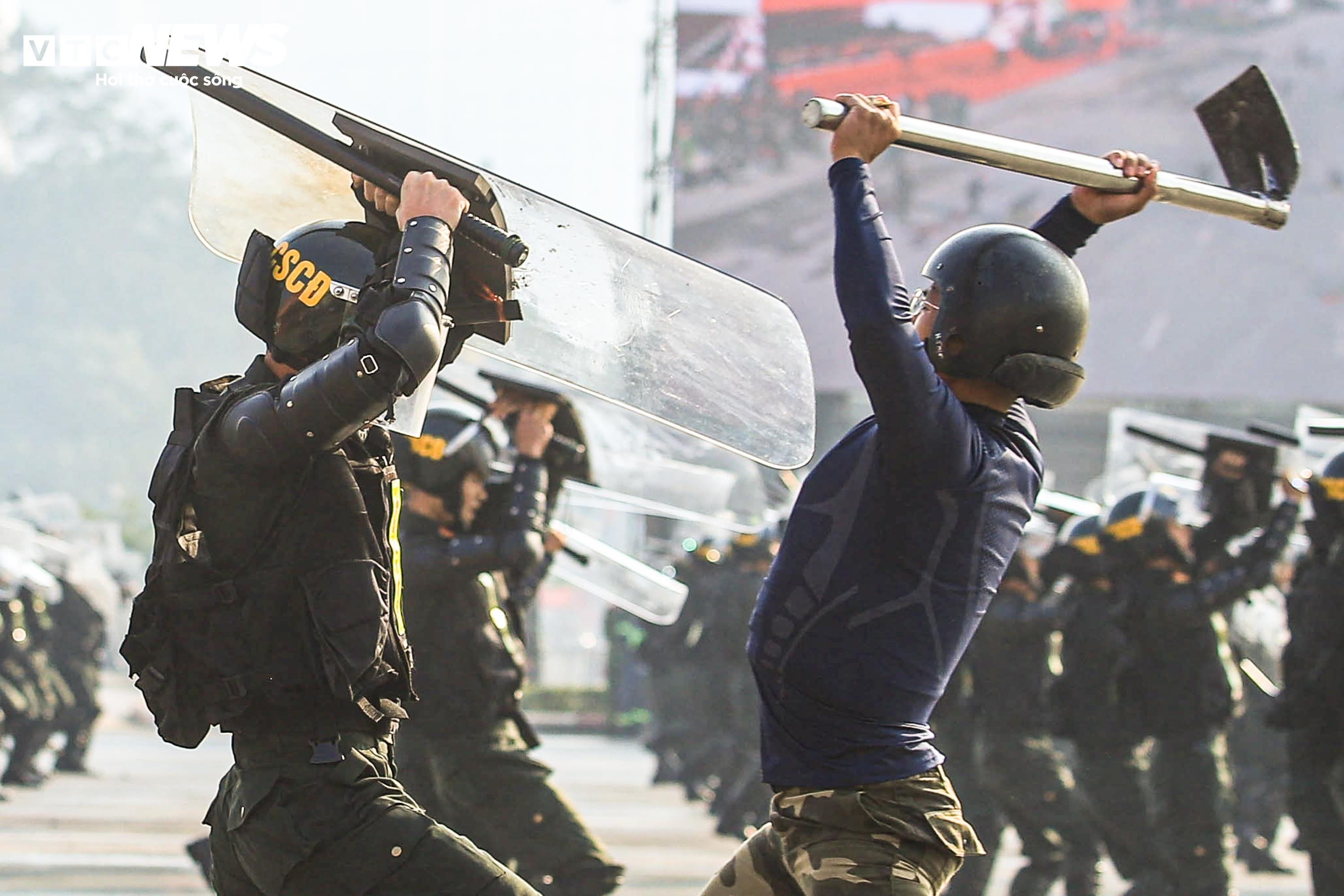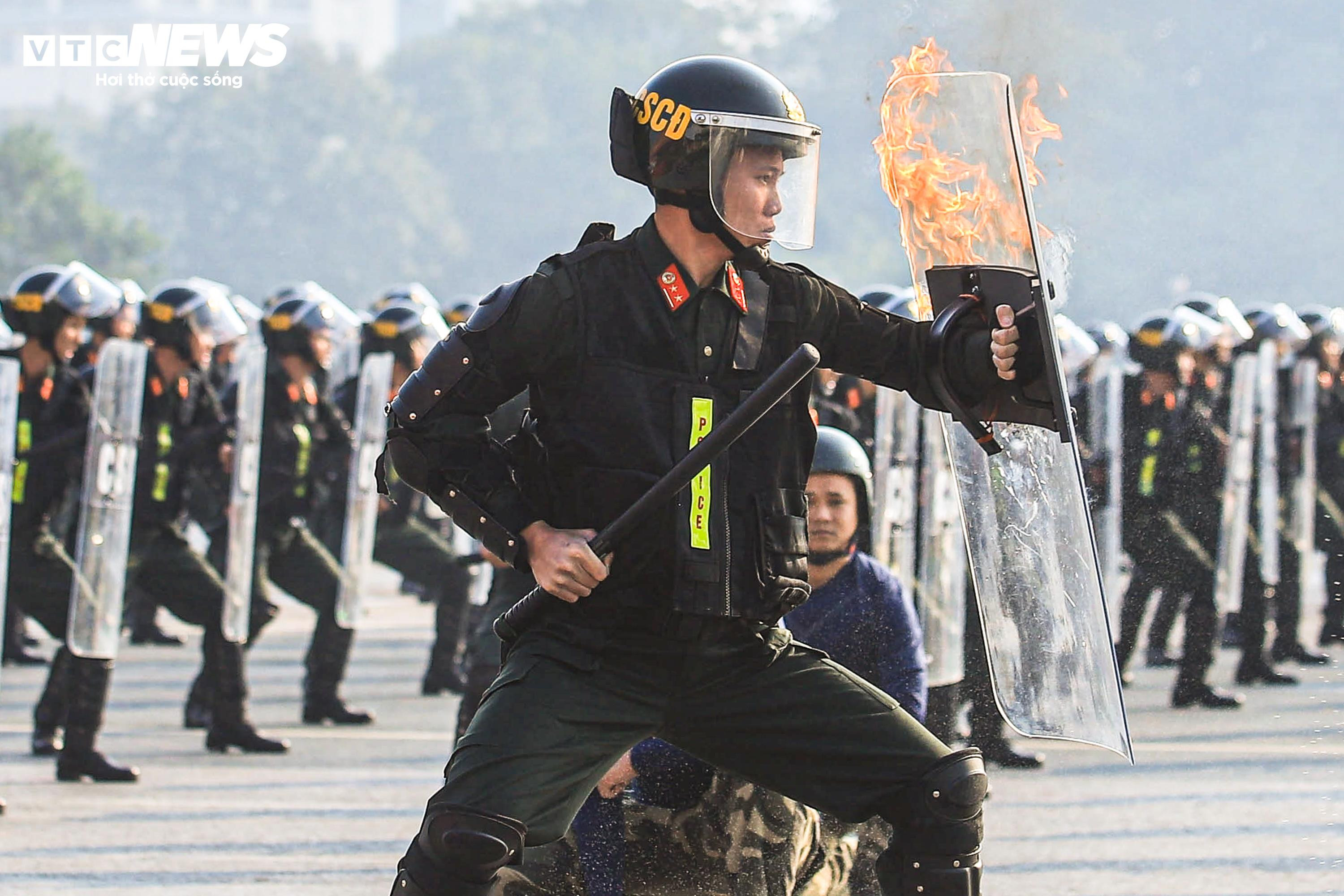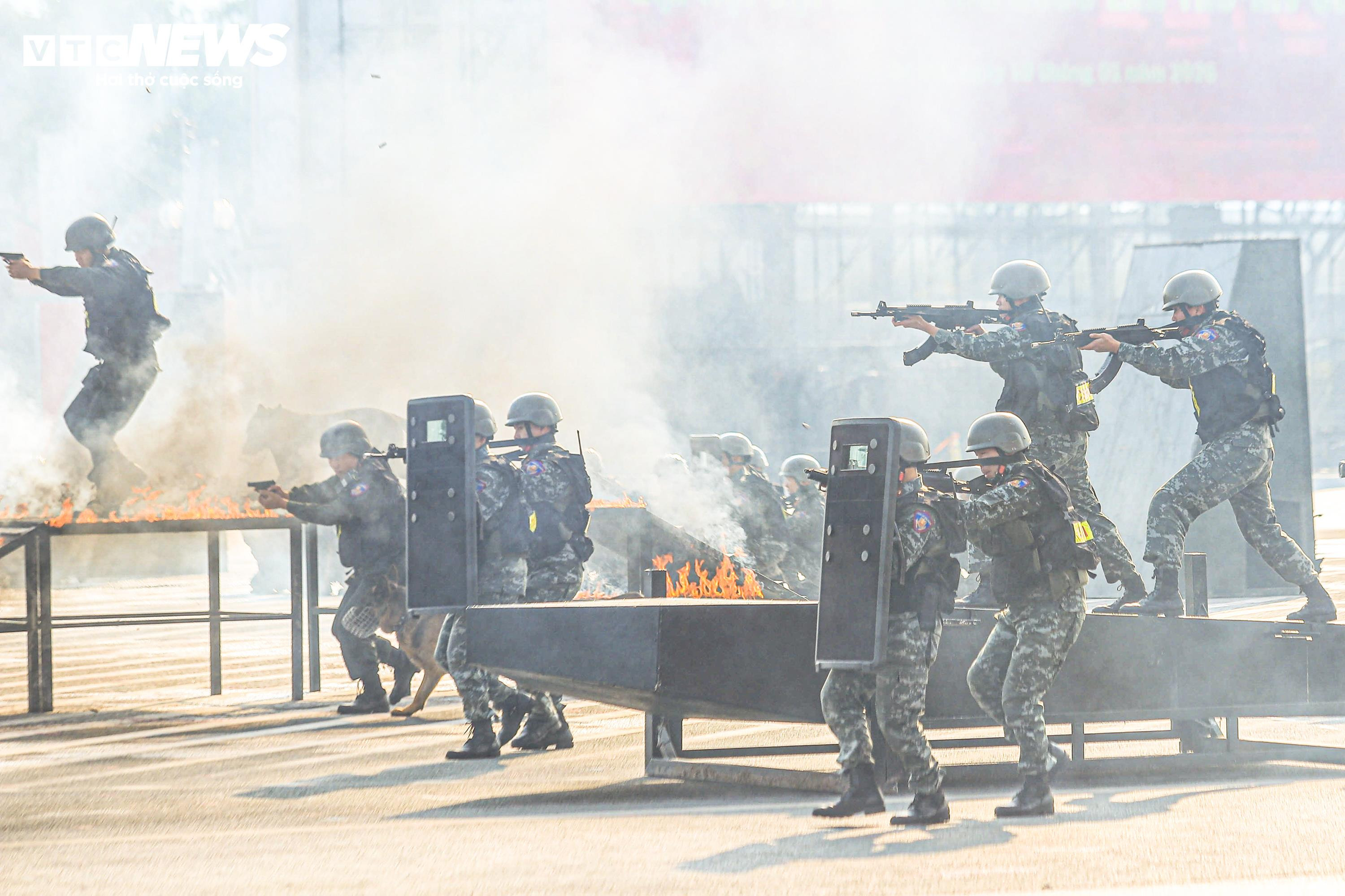 Ngay sau lễ xuất quân, lực lượng cảnh sát cơ động đã trình diễn các thế võ chiến đấu, kỹ thuật tấn công và trấn áp tội phạm, thể hiện khả năng xử lý nhanh, chính xác trong những tình huống nguy hiểm, đòi hỏi sự quyết đoán và bản lĩnh cao.