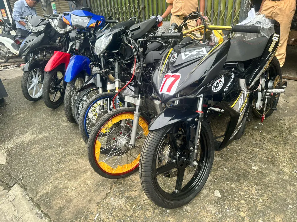 Nhiều mô tô có dấu hiệu bị “độ chế” được phát hiện trong quá trình kiểm tra. Ảnh: XH
