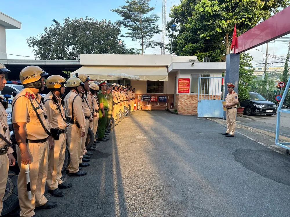 Trung tá Nguyễn Hoàng Tâm, Đội trưởng Đội CSGT Rạch Chiếc, chỉ đạo buổi ra quân kiểm tra, xử lý các lò độ xe trên địa bàn. Ảnh: XH