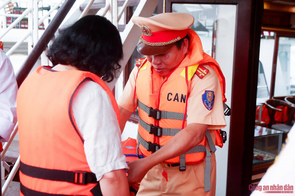 Lực lượng CSGT đường thủy phối hợp với hướng dẫn viên và chủ tàu trực tiếp tuyên truyền, hướng dẫn hành khách mặc áo phao đúng quy định trước khi tàu rời bến.