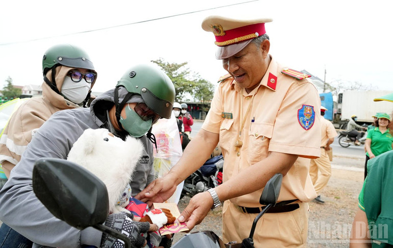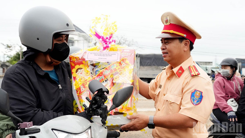 Đội Cảnh sát giao thông đường bộ số 3, Phòng Cảnh sát giao thông Công an tỉnh Lâm Đồng trao quà tặng người dân trên hành trình về quê đón Tết.