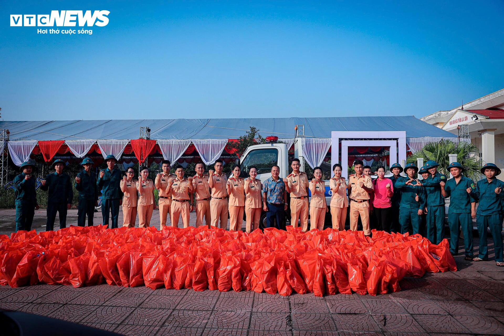 CSGT Hà Nội trao 300 suất quà cho người dân thôn Lai Sơn (xã Trung Giã), gồm ủng cao su, găng tay, dầu gió, thuốc, nước muối sinh lý, nước sát khuẩn và nhiều nhu yếu phẩm thiết yếu khác.