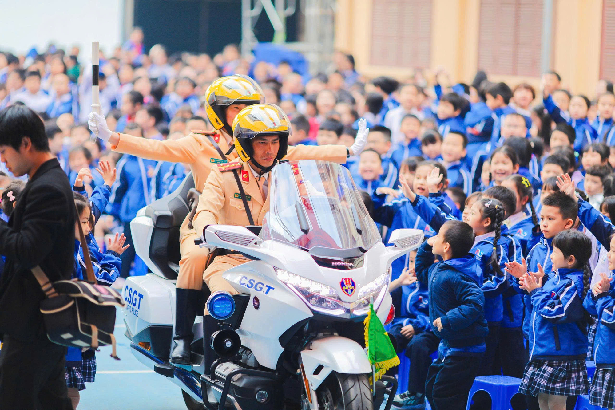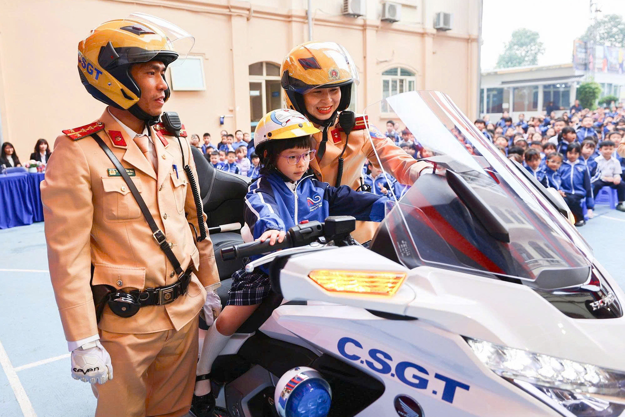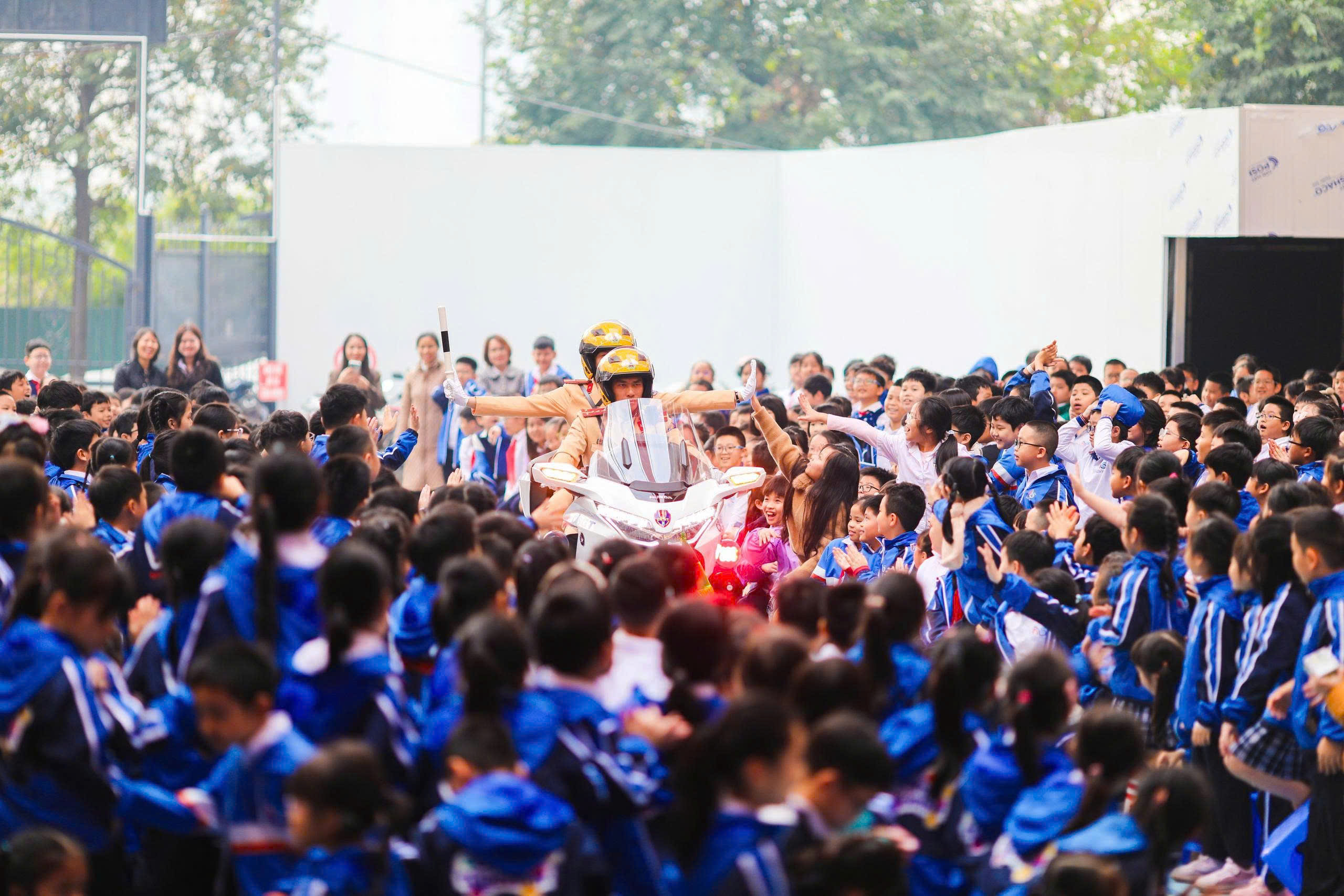 Các em nhỏ thích thú khi được làm quen với những chiến sĩ Cảnh sát giao thông trong Đội Tuần tra dẫn đoàn cùng chiếc xe Honda Gold Wing được mệnh danh là “pháo đài di động” của lực lượng Cảnh sát giao thông