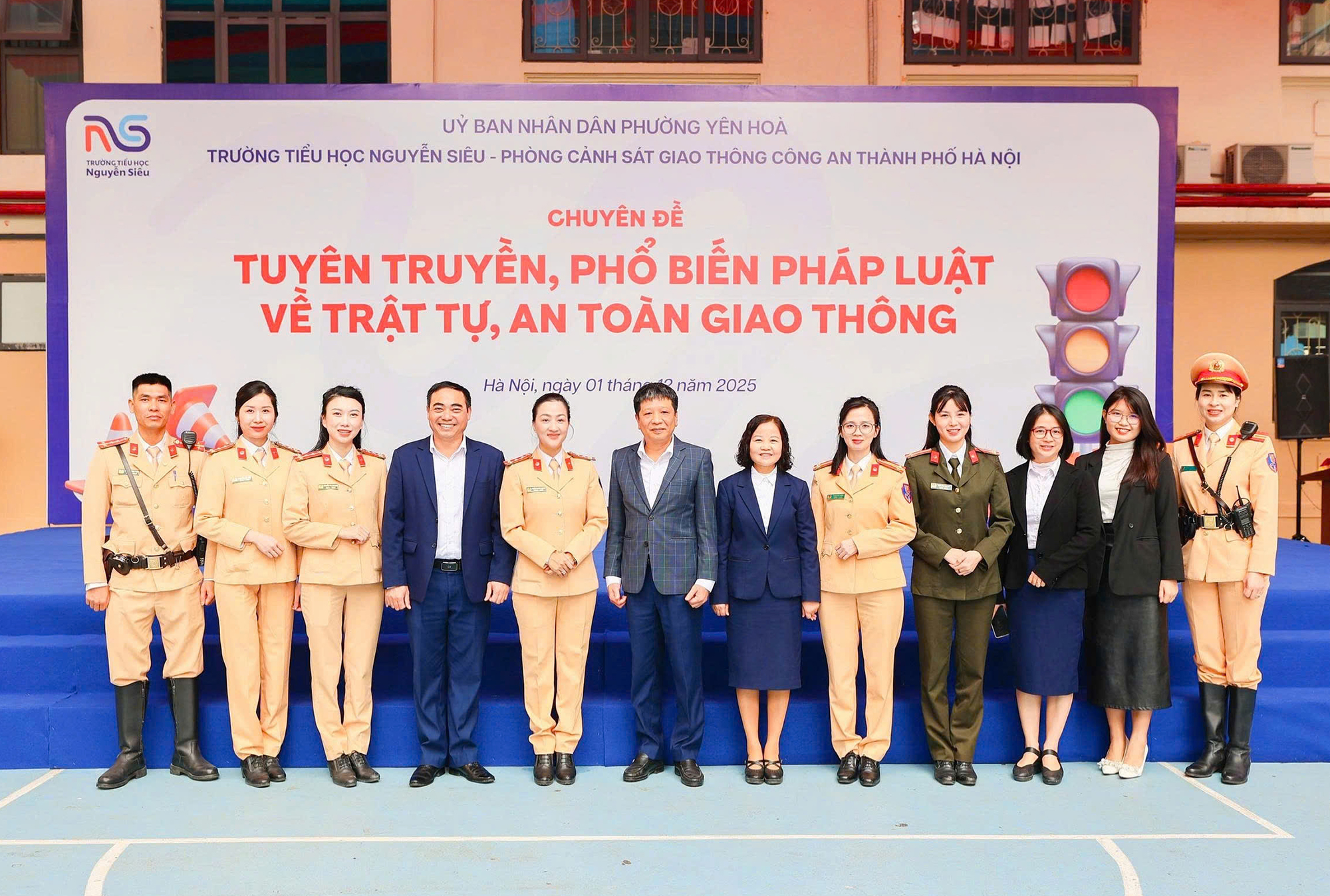 Đại diện Hội phụ nữ Công an thành phố Hà Nội; Hội phụ nữ Phòng Cảnh sát giao thông cùng giáo viên, phụ huynh học sinh tại buổi tuyên truyền