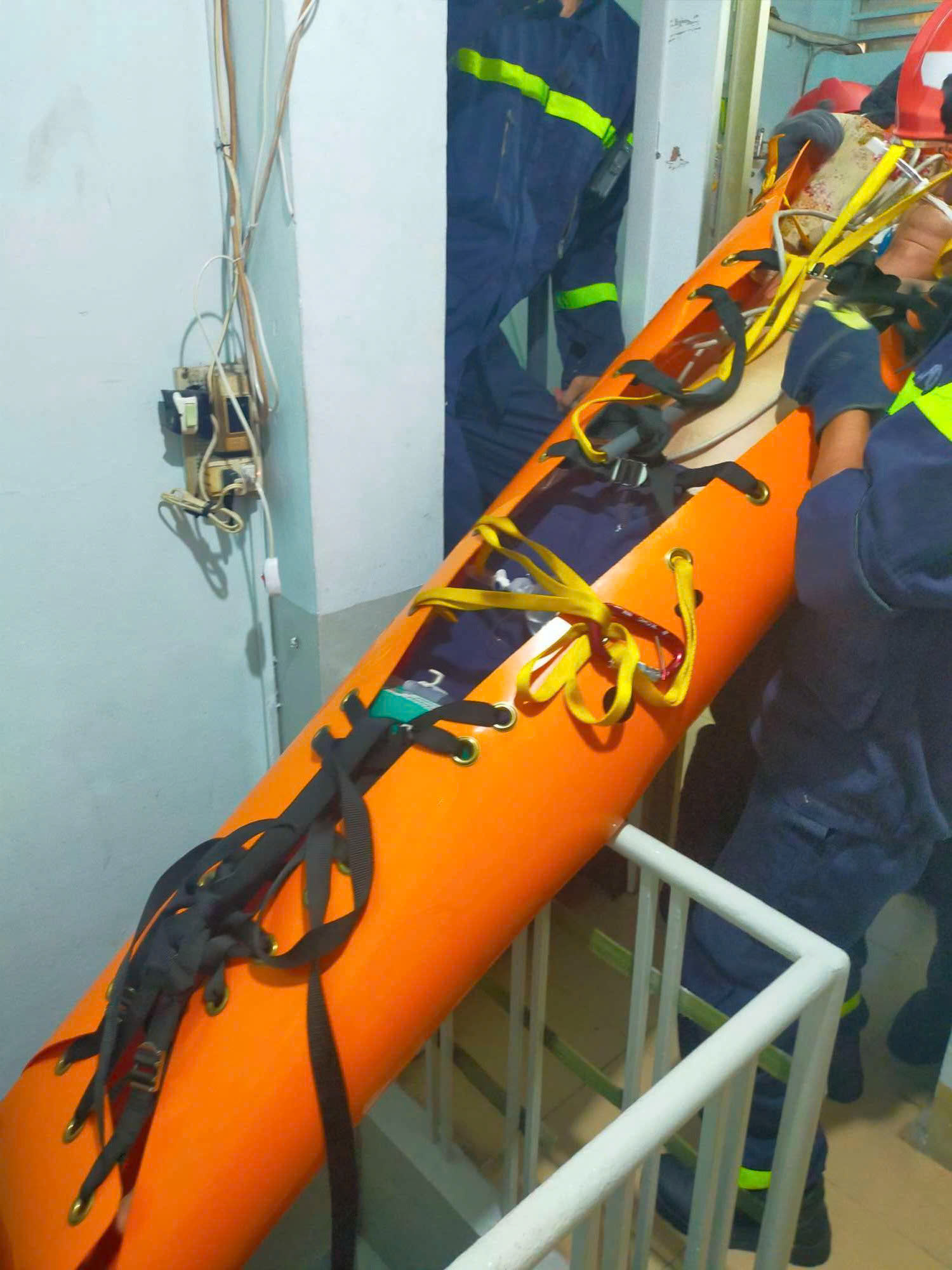 Cầu thang xoắn, nhỏ, hẹp nên lực lượng chức năng phải sử dụng cáng chuyên dụng.