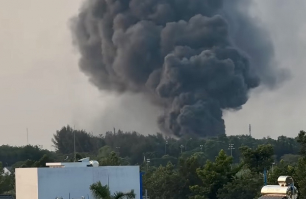 Vụ cháy tạo thành cột khói đen cao hơn 100m.