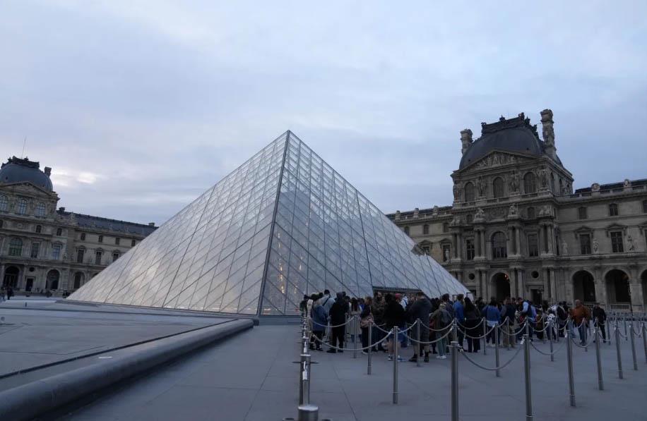 Du khách xếp hàng vào bảo tàng Louvre 3 ngày sau khi những món đồ trang sức lịch sử bị đánh cắp trong một vụ trộm táo bạo vào ban ngày, ngày 22/10/2025 tại Paris (Ảnh: AP)