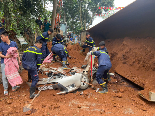 Ngay sau đó, lực lượng Cảnh sát PCCC và CNCH tiếp tục sử dụng các phương tiện chuyên dụng tìm kiếm nạn nhân còn lại đang bị vùi lấp và lúc 9h7' đã tiếp cận, đưa được thi thể nạn nhân nữ thứ 2 điều khiển xe ô tô là bà N.T.T.H (SN 1979) - giáo viên, trú tại xóm Đội 5, xã Đại Đồng, tỉnh Phú Thọ ra ngoài.
