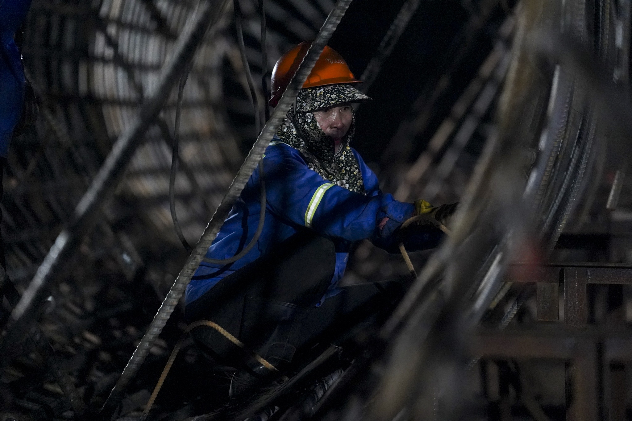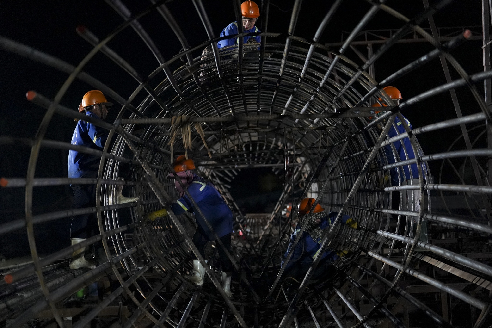 Các tổ thi công luôn phải canh chính xác thời điểm nước ròng để tranh thủ xử lý những phần việc yêu cầu độ chuẩn xác cao. Khi nước rút, hàng chục nhóm công nhân lập tức vào vị trí, triển khai đặt tấm đáy, gia cố hố móng, đan lồng thép và chuẩn bị thiết bị thi công.