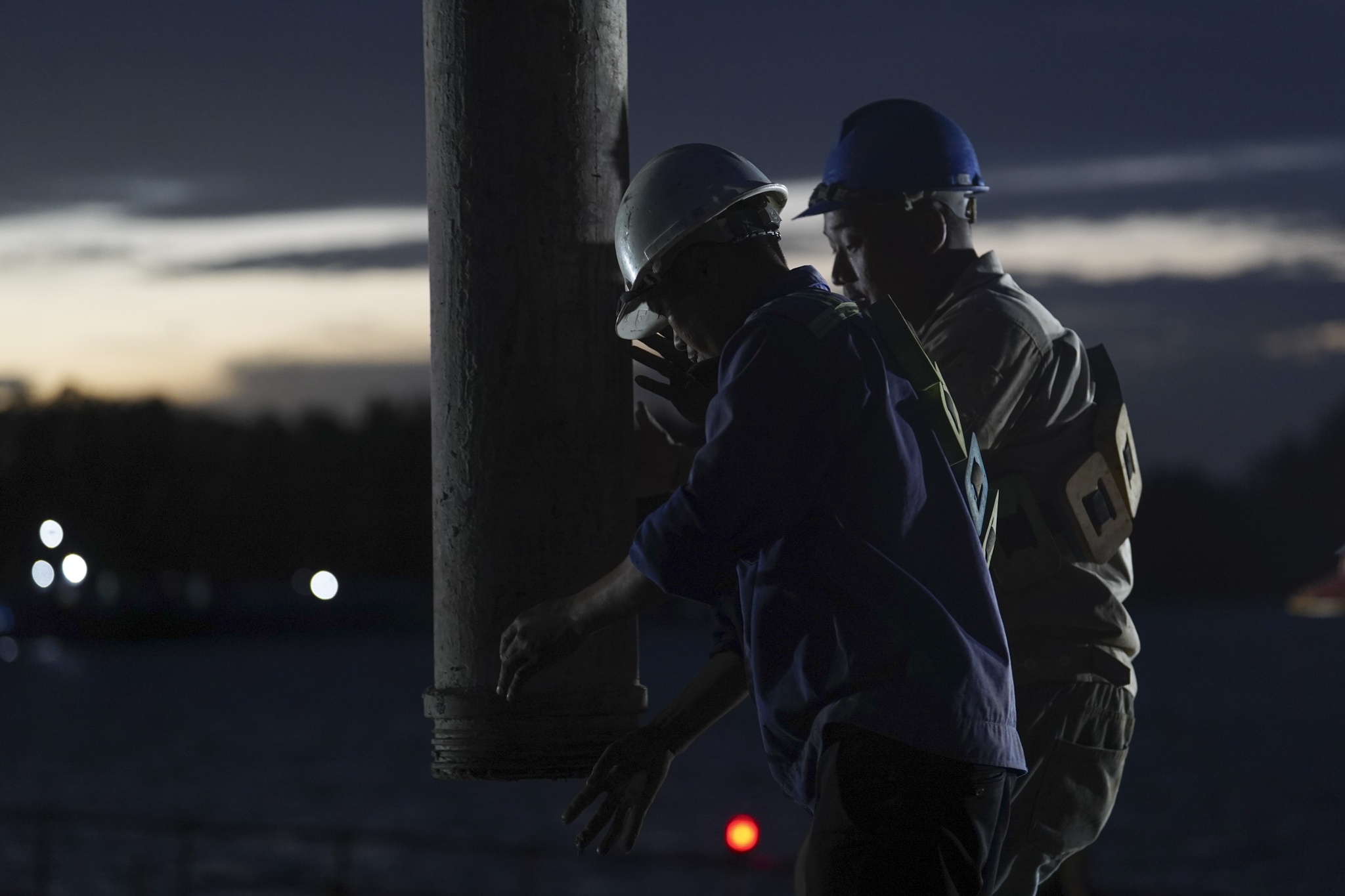 Tại hai trụ neo, khoảng 60 công nhân túc trực ngày đêm. Ông Hoàng Văn Linh, Tổ trưởng giám sát, cho biết: "Triều cường thay đổi liên tục tạo áp lực lớn. Nhưng nhờ chuẩn bị kỹ thiết bị và nhân lực, chúng tôi tranh thủ từng giờ nước ròng để hoàn thiện hạng mục kịp tiến độ".