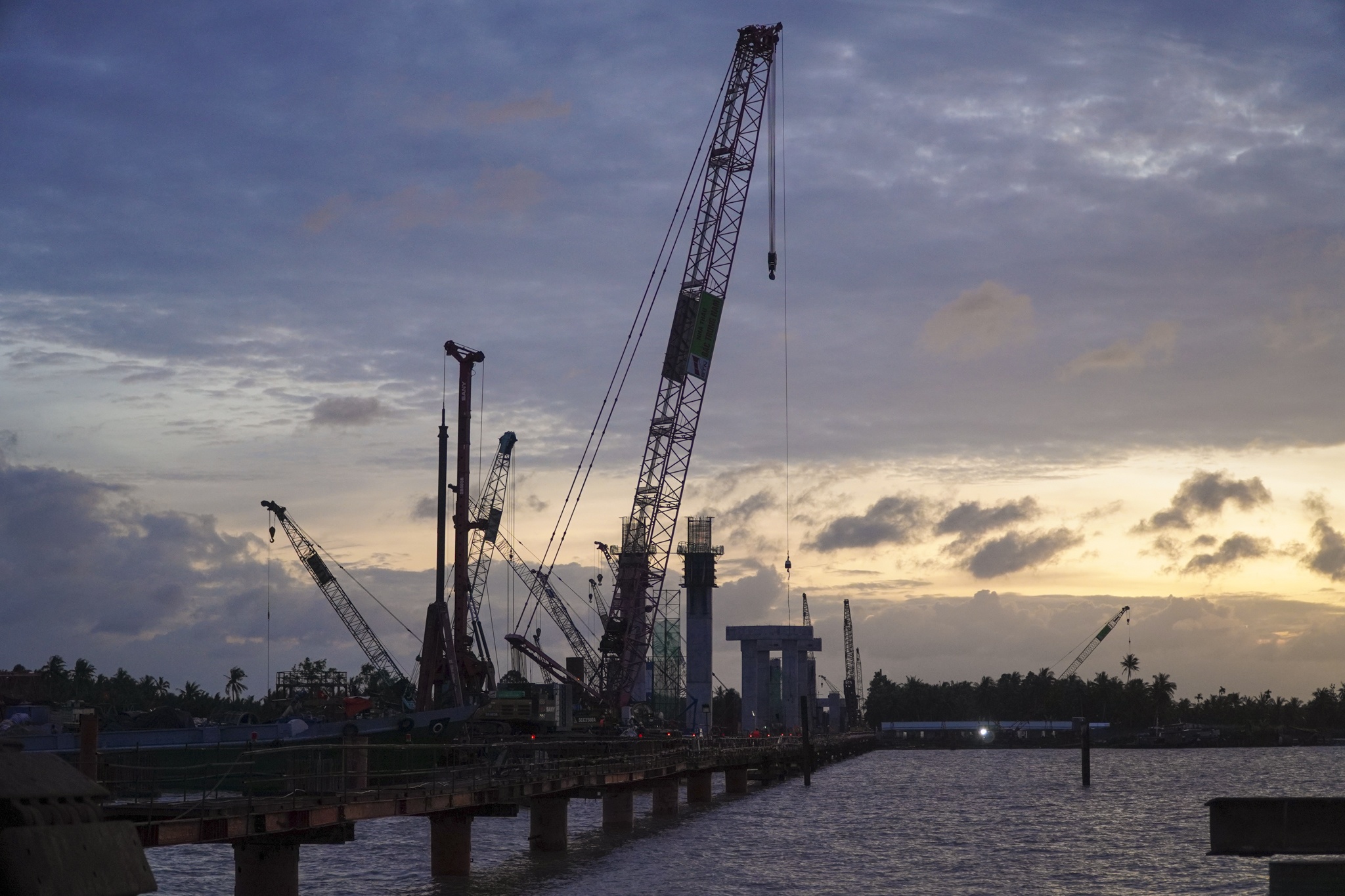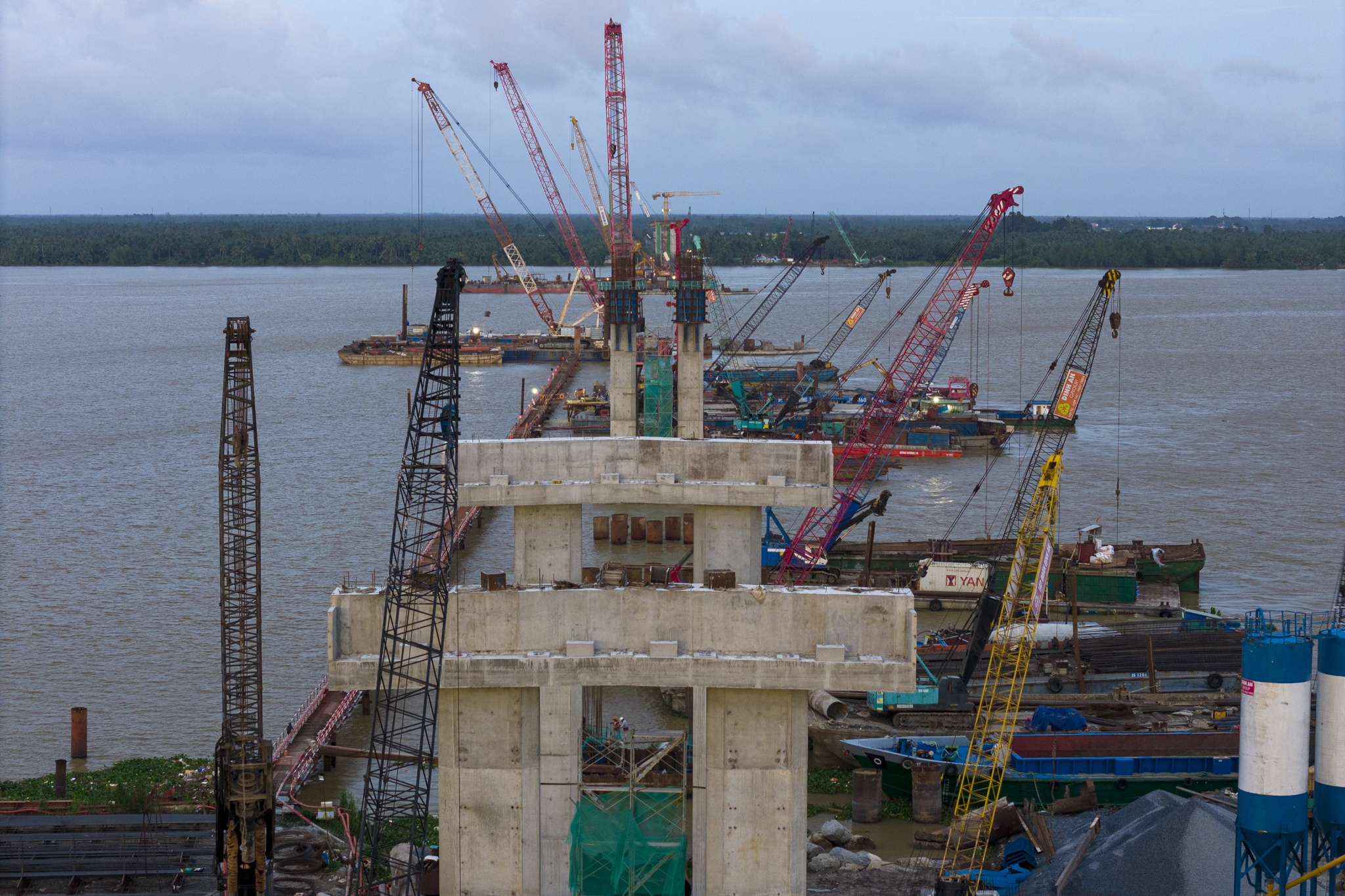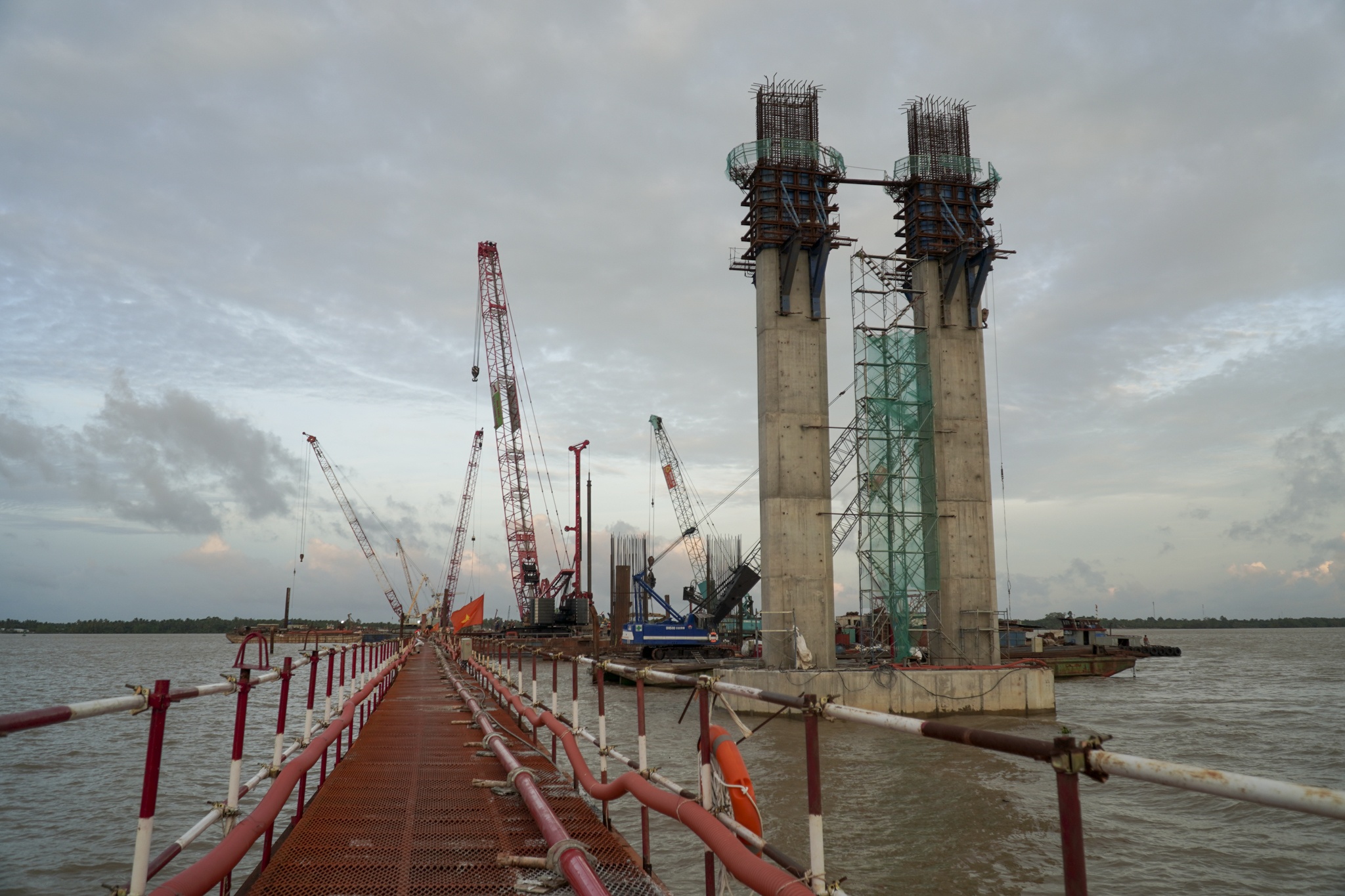Trong giai đoạn hiện nay, thách thức lớn nhất của dự án là con nước. Triều cường trên sông Hậu lên xuống thất thường, ảnh hưởng trực tiếp đến các hạng mục khoan cọc, đổ bê tông hay lắp dựng ván khuôn dưới nước.