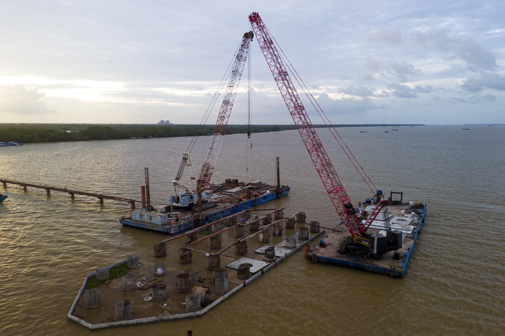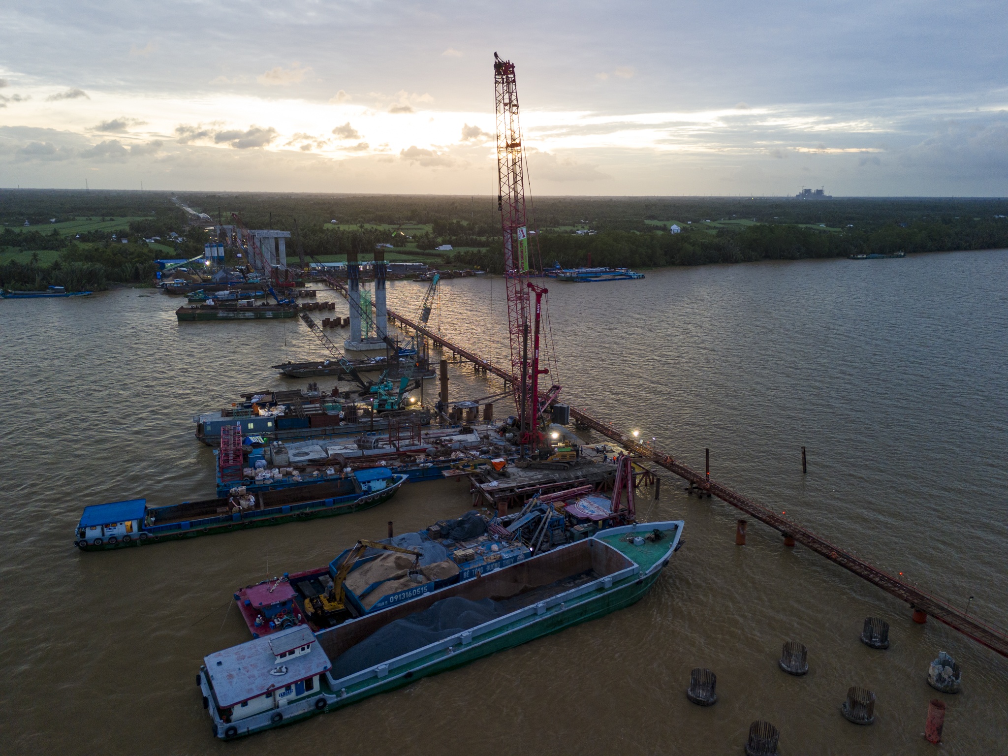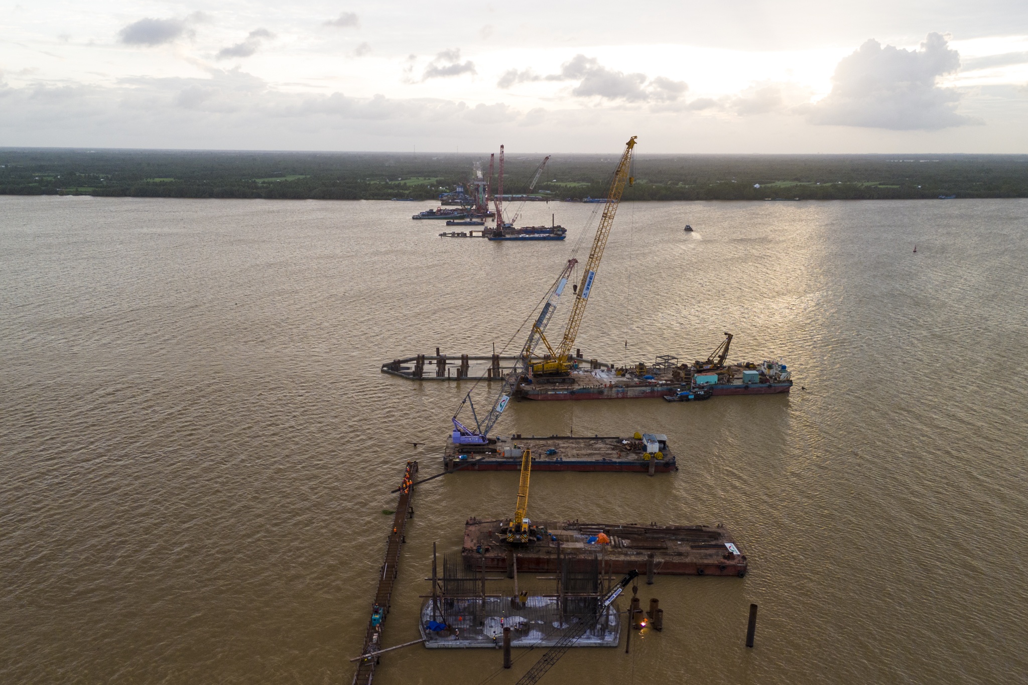 Trong giai đoạn hiện nay, thách thức lớn nhất của dự án là con nước. Triều cường trên sông Hậu lên xuống thất thường, ảnh hưởng trực tiếp đến các hạng mục khoan cọc, đổ bê tông hay lắp dựng ván khuôn dưới nước.