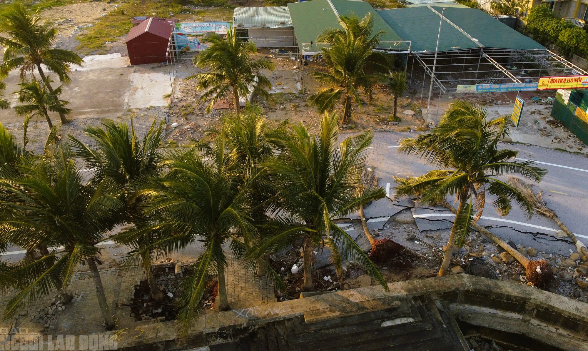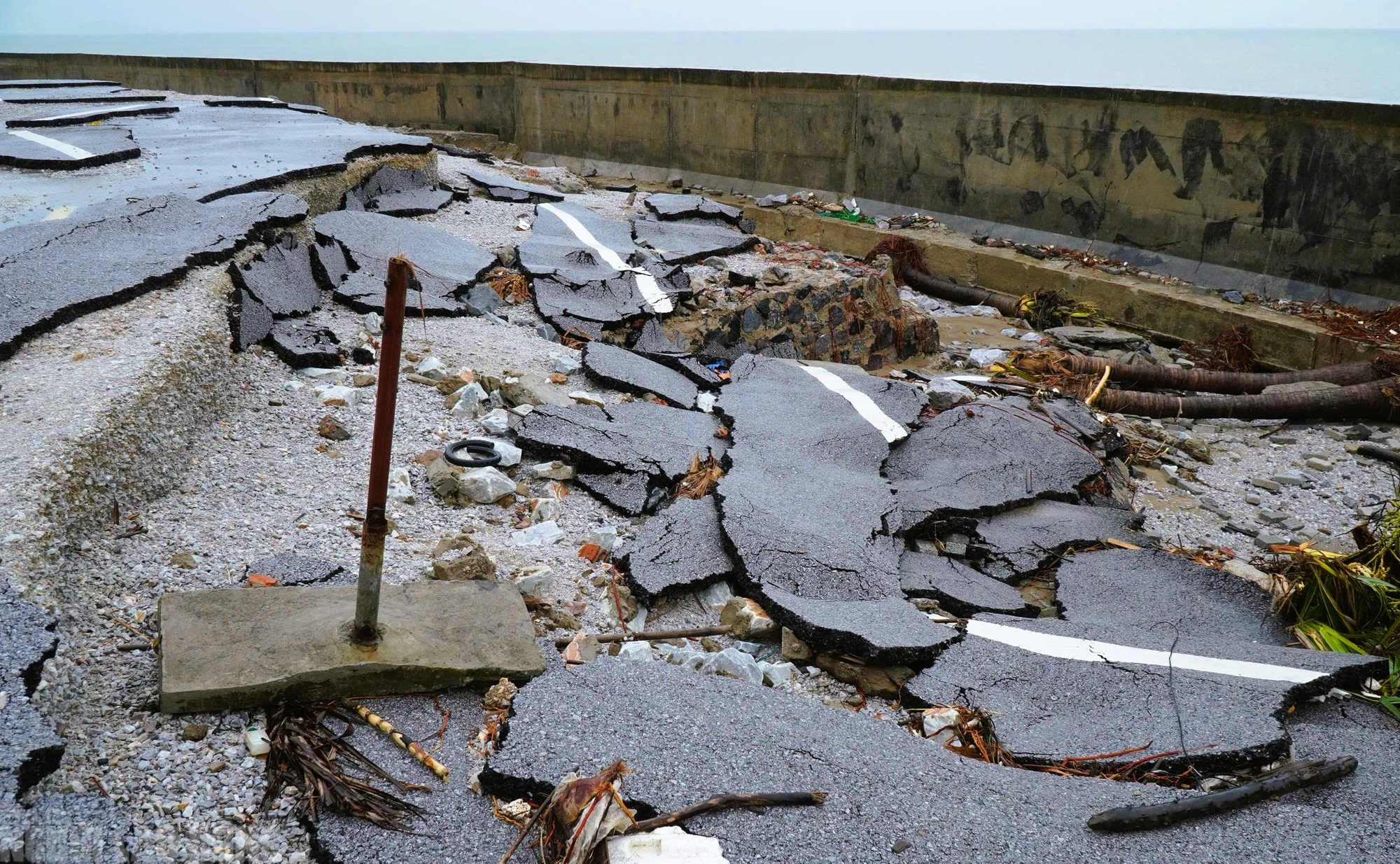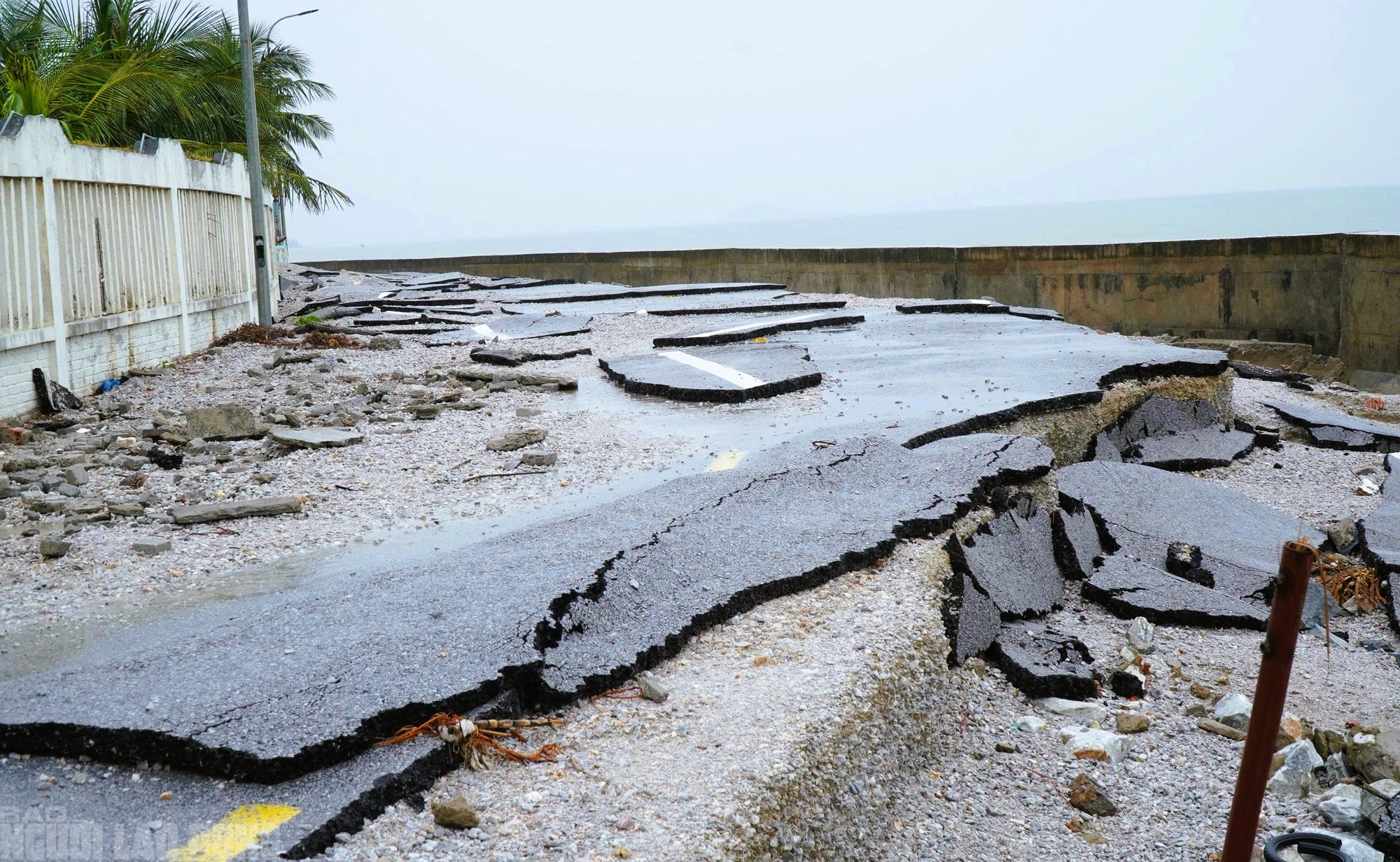 Đường ven bờ biển Hải Tiến sụt lún khiến những mảng đường nứt gãy khắp nơi