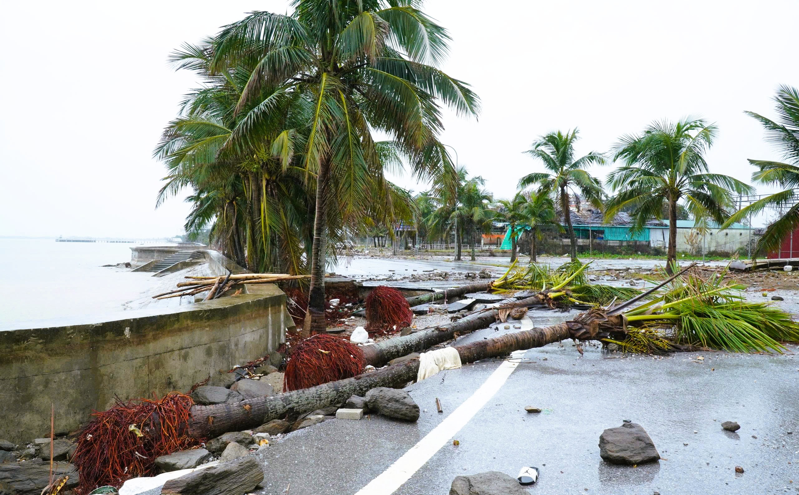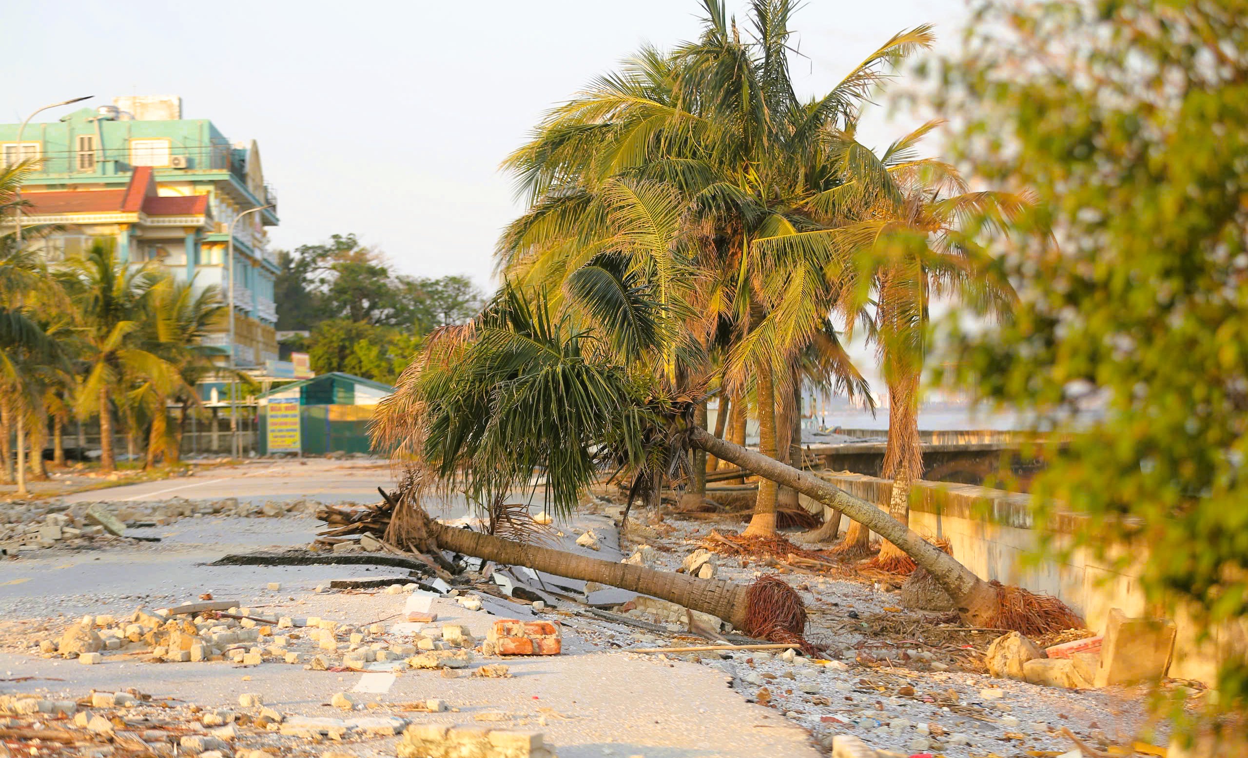 Nhiều nơi cây dừa bật gốc, đổ gãy ngổn ngang, đường giao thông có nơi nứt gãy, sụt lún, tụt sâu cả mét, bờ kè có chỗ nứt toác...