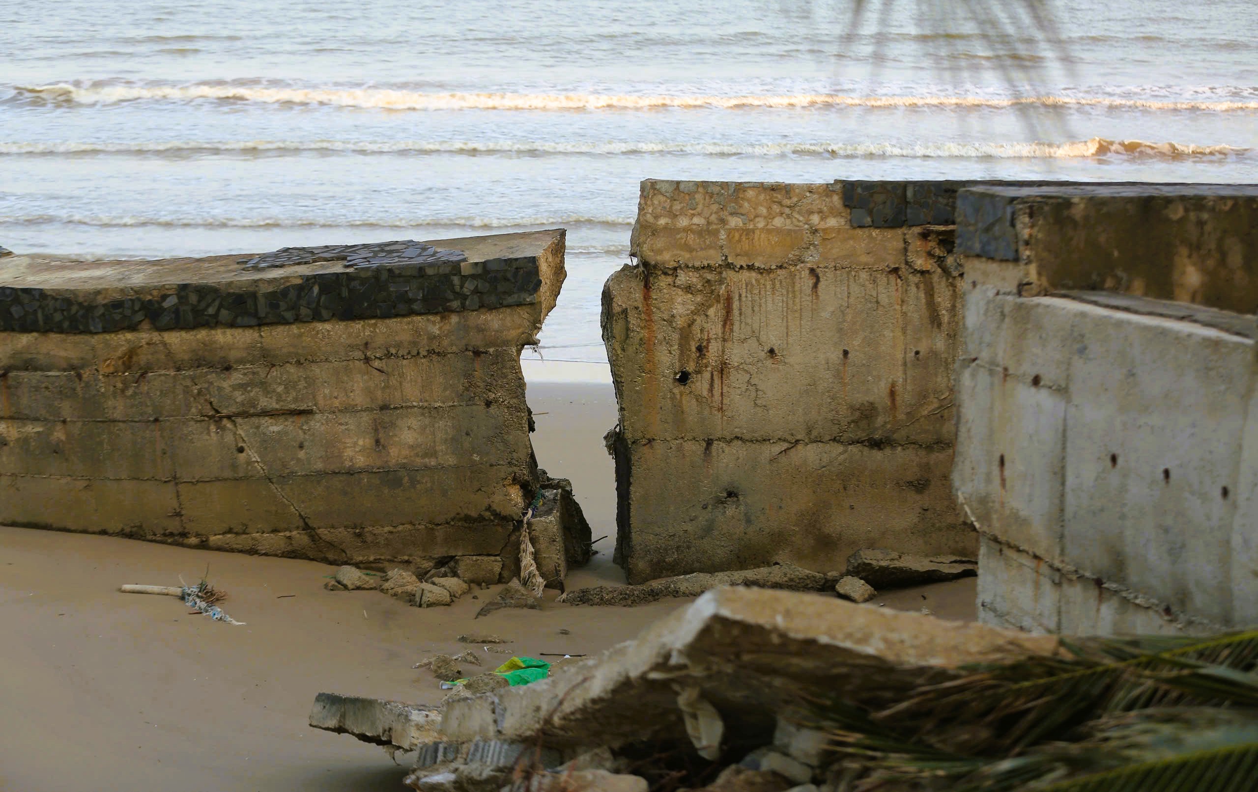 Bờ biển Hải Tiến tụt sâu cả mét lộ bờ kè bảo vệ bờ biển phía ngoài