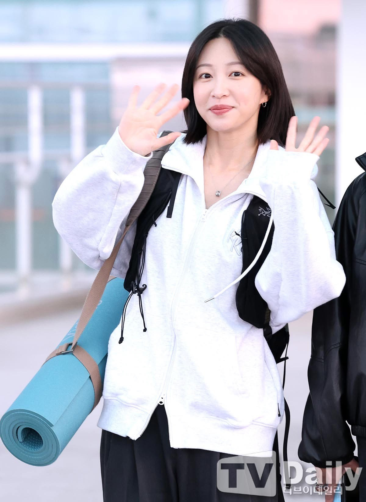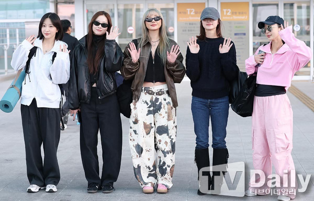 Đội hình các thành viên của EXID mang vác đồ cá nhân, có cả thảm yoga tại sân bay Incheon, Hàn Quốc trước khi hạ cánh tại sân bay Tân Sơn Nhất.