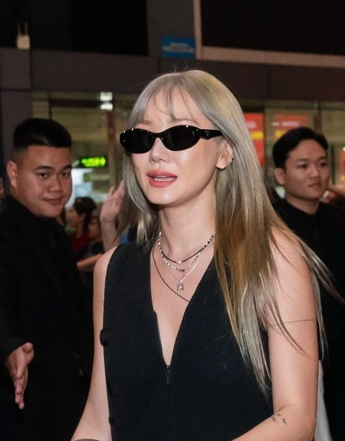 Rapper LE của EXID xuất hiện nổi bật với mái tóc bạch kim, phong cách hầm hố và chỉn chu khi vừa đáp sân bay Tân Sơn Nhất.