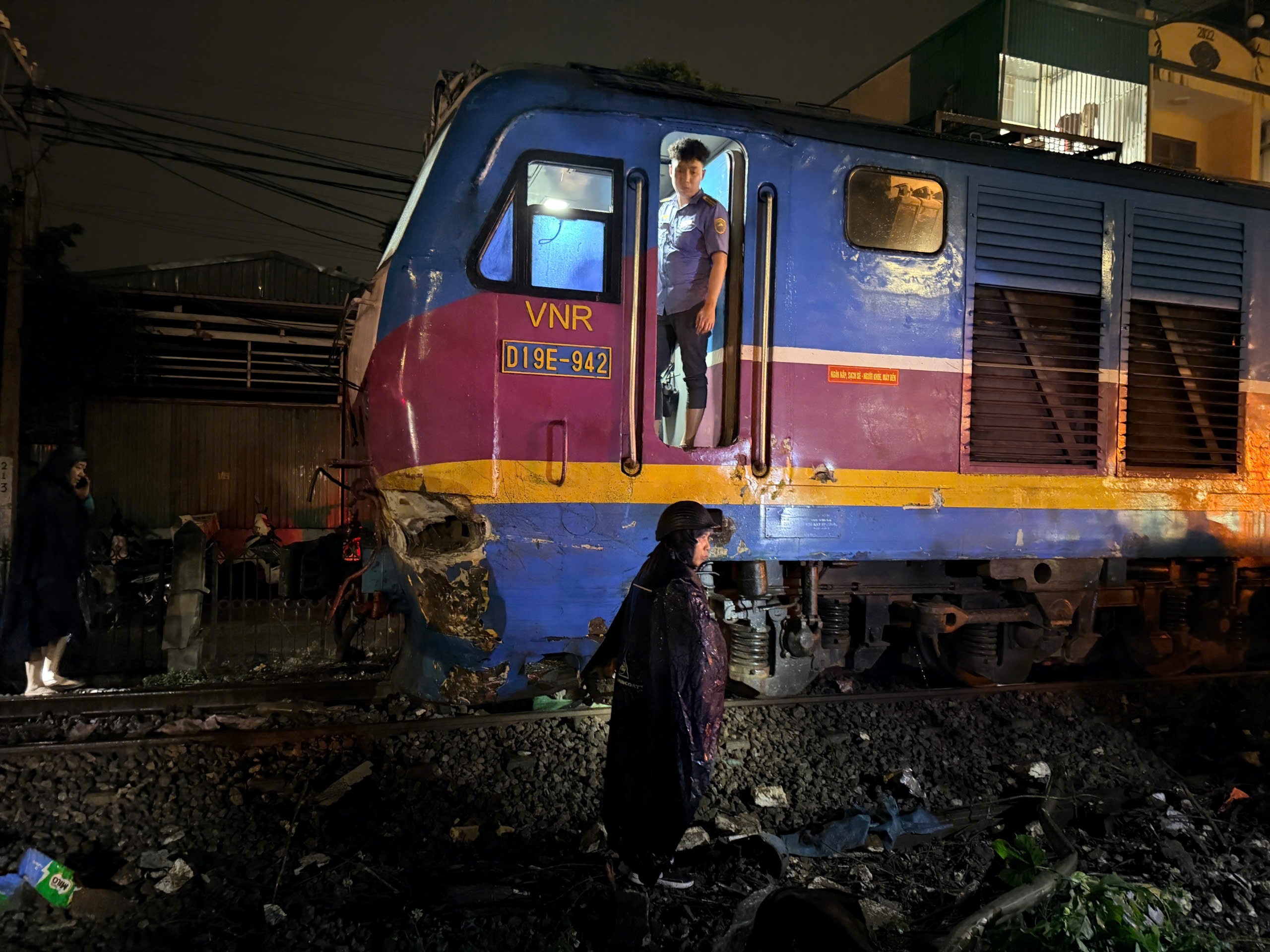 Đúng lúc này, đoàn tàu SE3 lao tới, tông trực diện rồi kéo lê phương tiện một đoạn dài. Cú va chạm mạnh khiến xe tải bị biến dạng nghiêm trọng, mắc kẹt ở đầu tàu; đầu máy tàu khách cũng hư hỏng nặng.