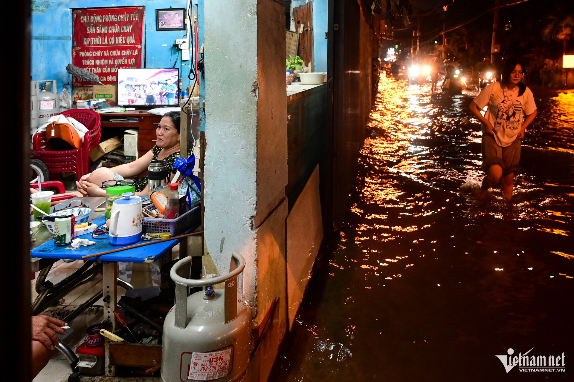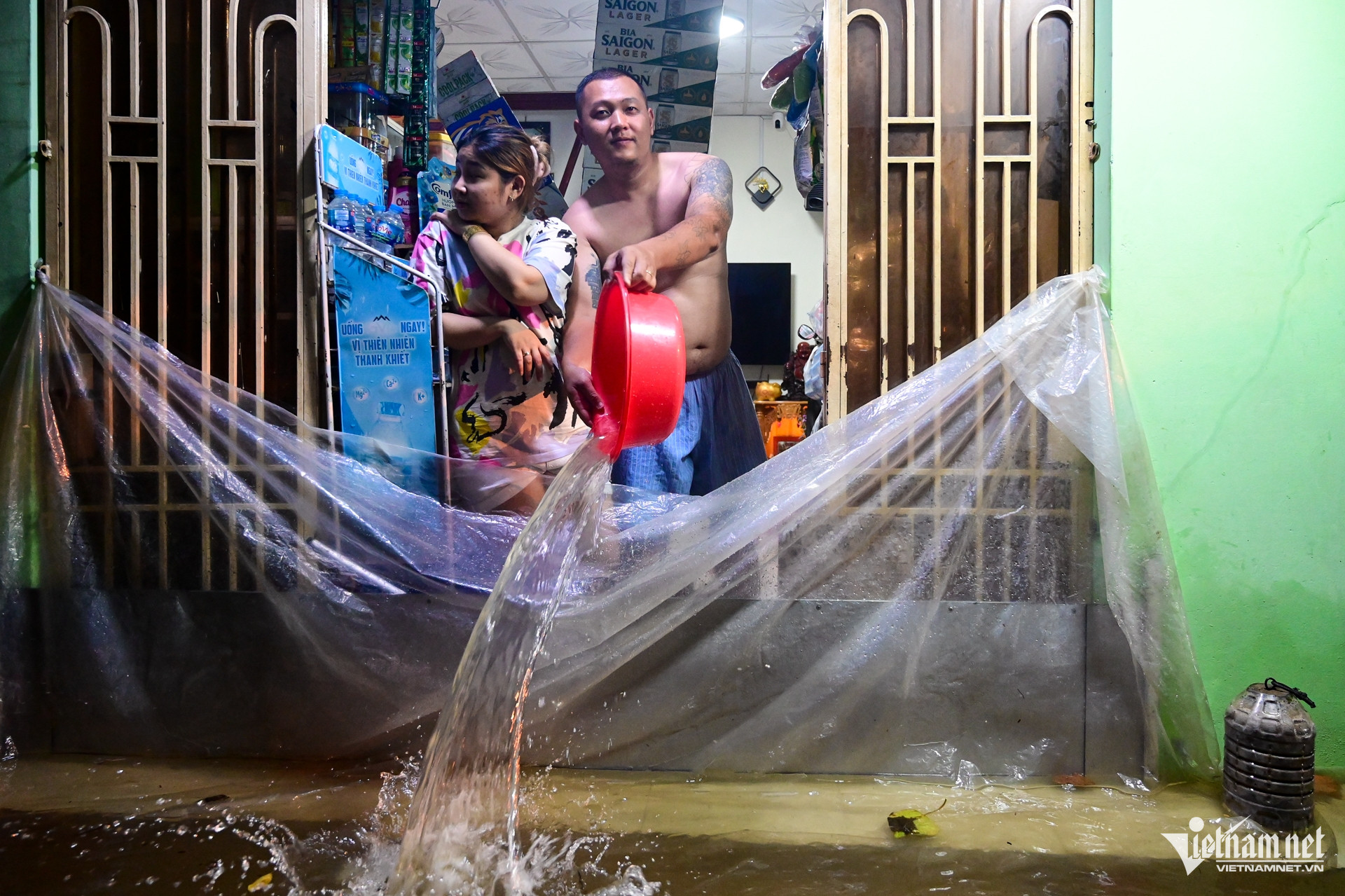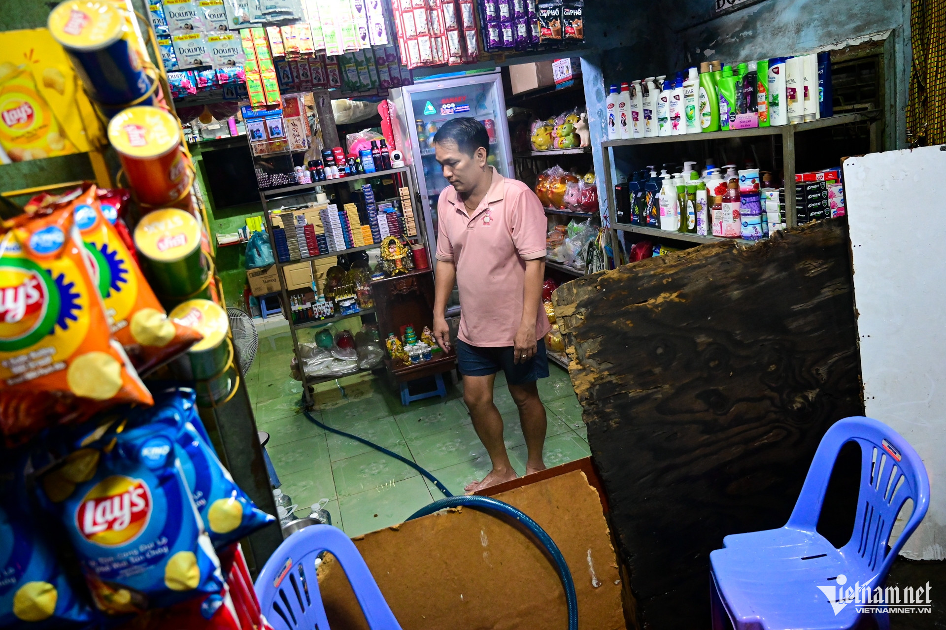 Gần đó, anh Nguyễn Hoàng Lâm cho biết, gia đình bán tạp hóa nên mỗi khi nước dâng phải kê hàng hóa và đồ đạc lên cao. “Hôm trước không kịp kê, nước ngập sâu làm hư hai chiếc tủ gỗ”, anh nói.