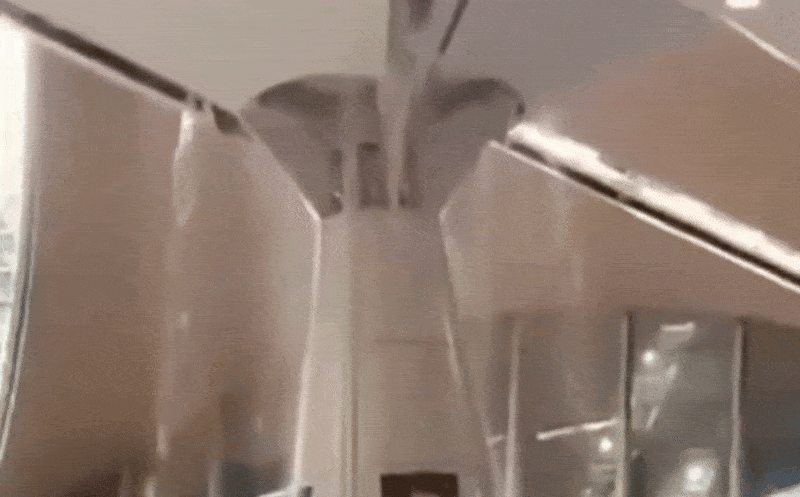 Các video đăng trên X và Facebook cho thấy nước chảy mạnh từ điểm tiếp giáp giữa mái và cột trụ, ngay giữa hai dãy quầy check-in. Nhiều hành khách và nhân viên đứng nhìn dòng nước như "thác trong nhà", không biết phải làm gì. Một số người vẫn tiếp tục xếp hàng.
