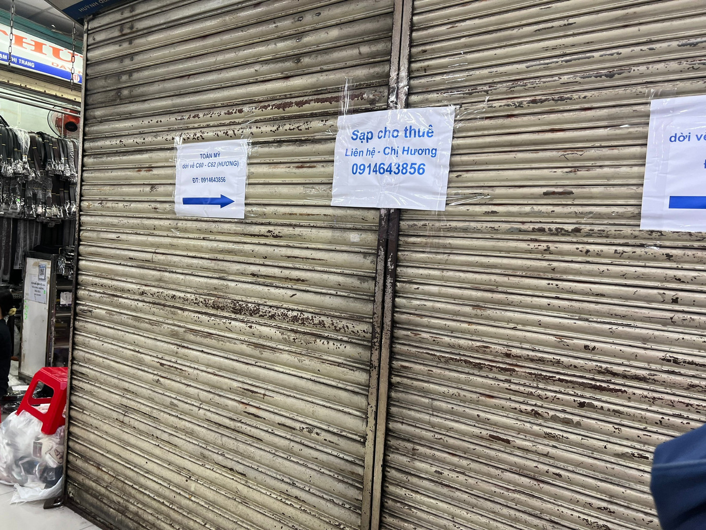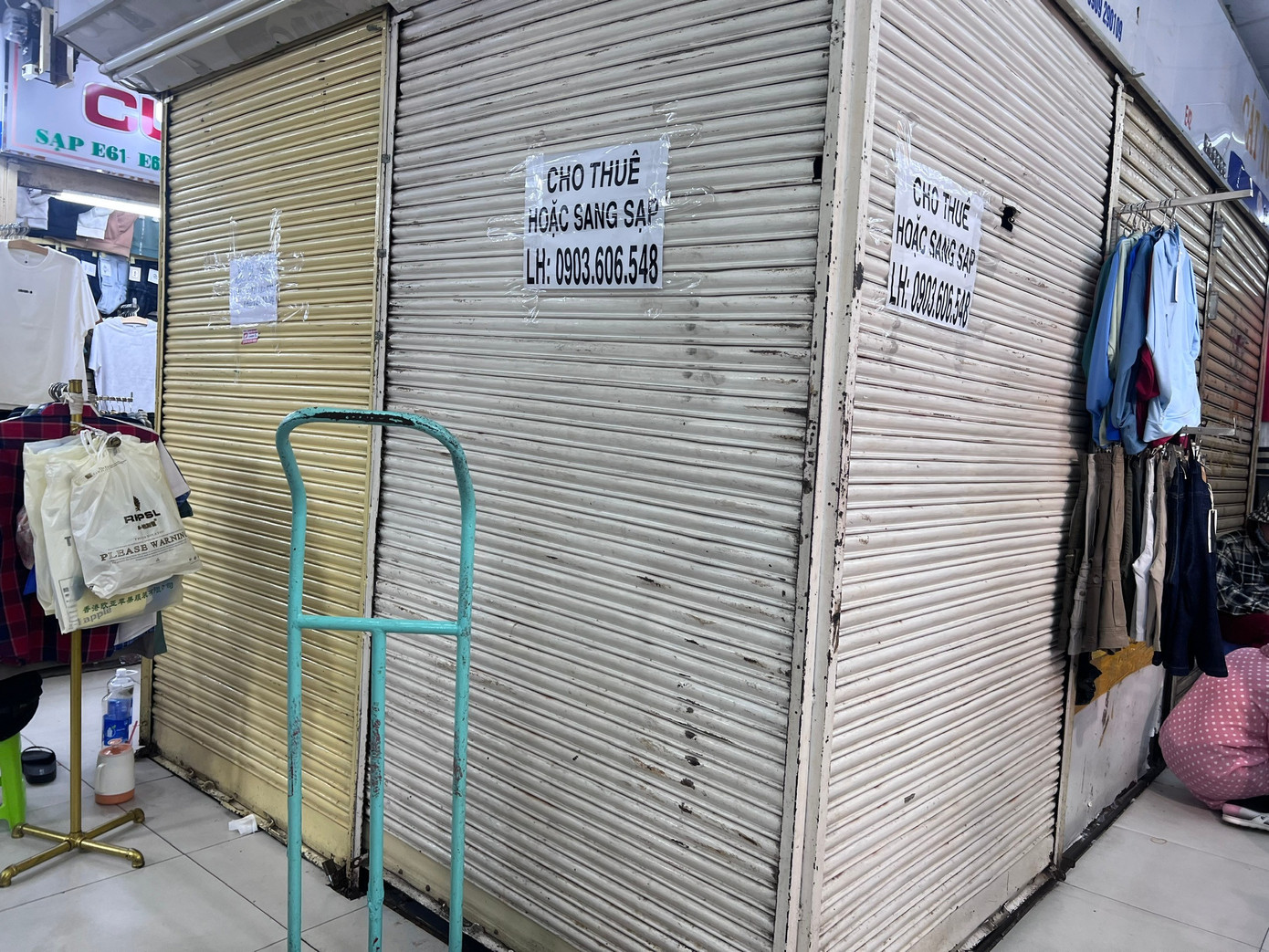Thời hưng thịnh, tiểu thương thuê thêm quầy sạp làm kho, nay buôn bán khó khăn, họ cũng không có nhu cầu trữ hàng như trước. Các tờ giấy thông tin cho thuê quầy sạp dán dọc các ki-ốt.