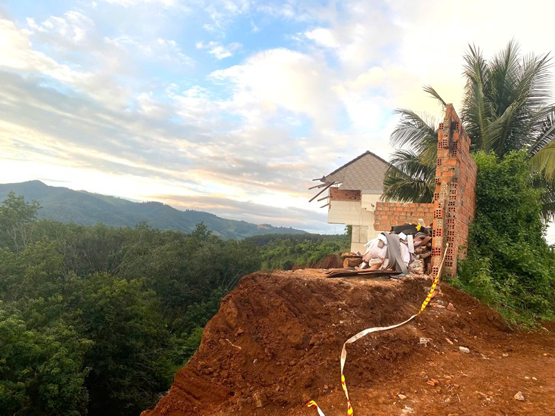 Căn nhà của ông Lê Văn Yên gần như bị sập hoàn toàn xuống vực sâu, chỉ còn lại bờ tường phía trước và cổng ra vào. Ảnh: CTV