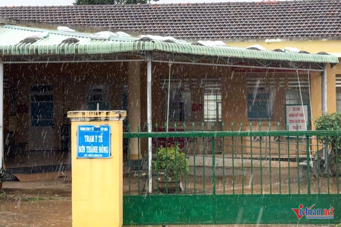 Mái tôn của Trạm Y tế xã Sơn Thành Đông chất đầy bao cát. Ảnh: Hải Dương