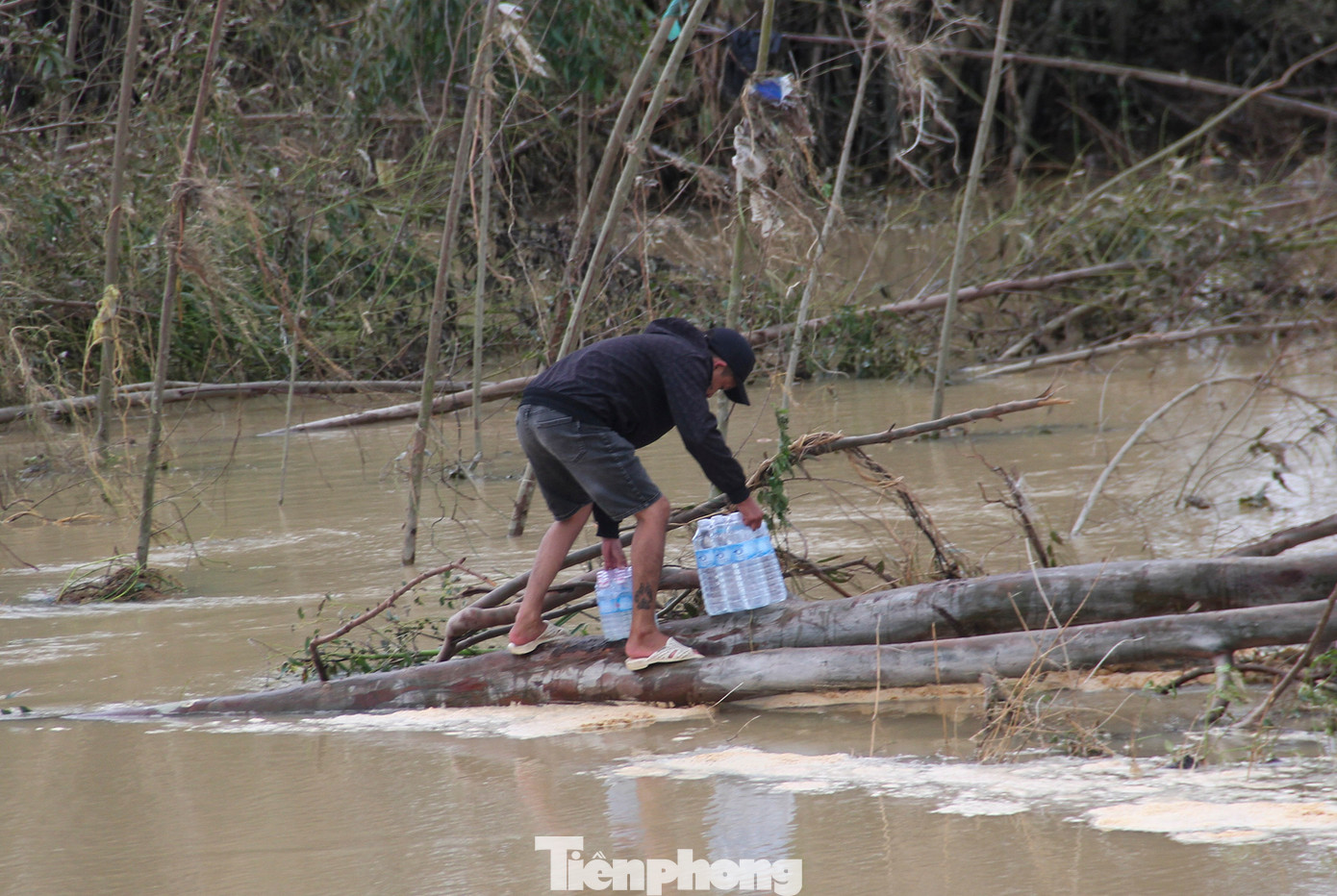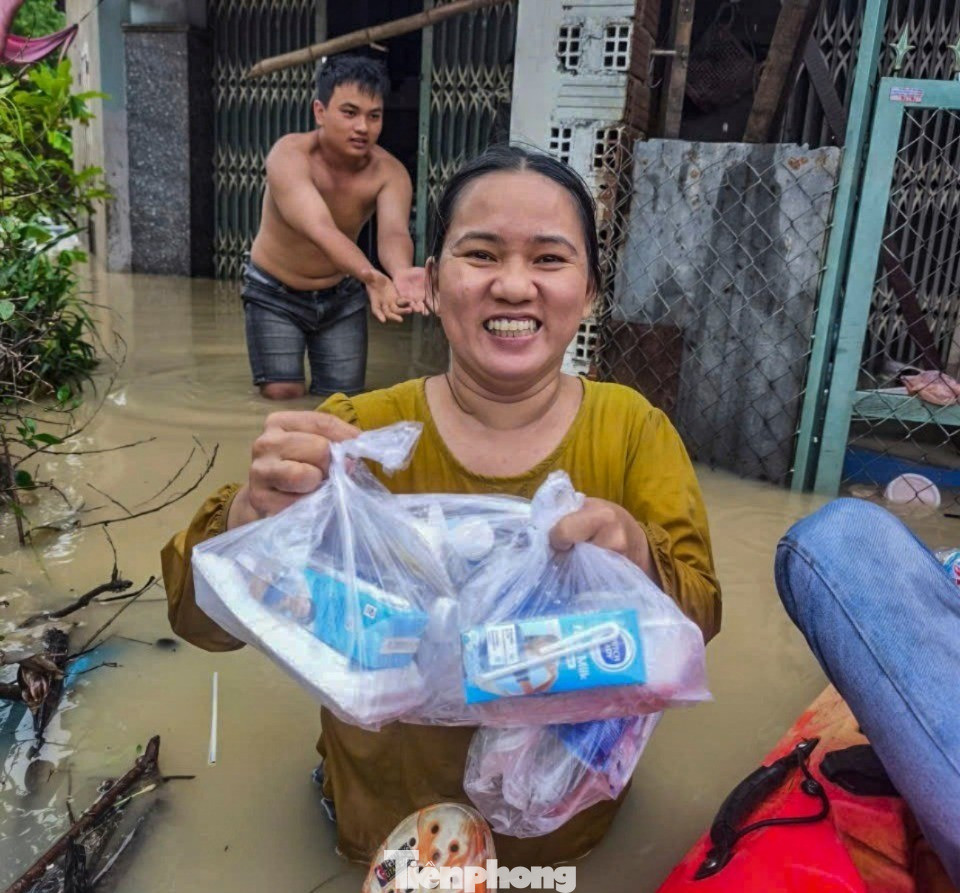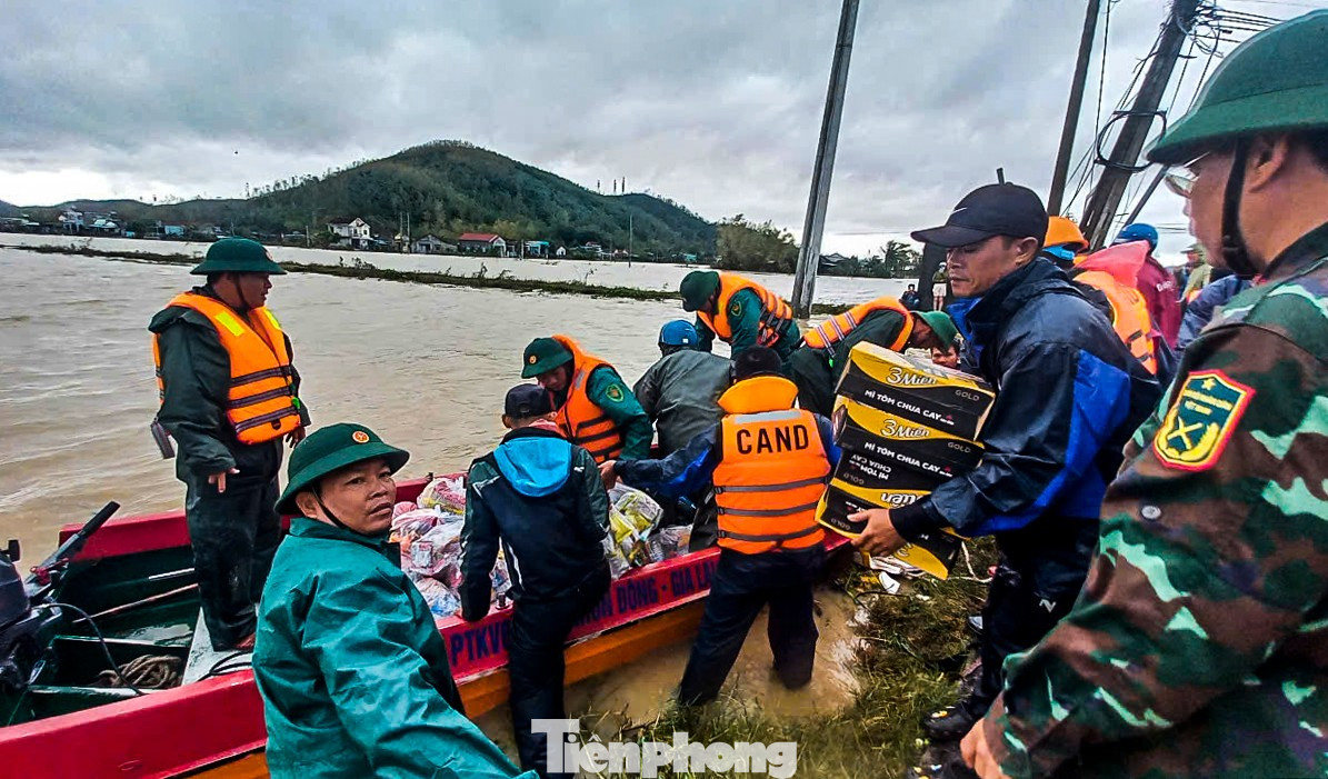 Các lực lượng mang nhu yếu phẩm đến hỗ trợ người dân vùng bị ngập.