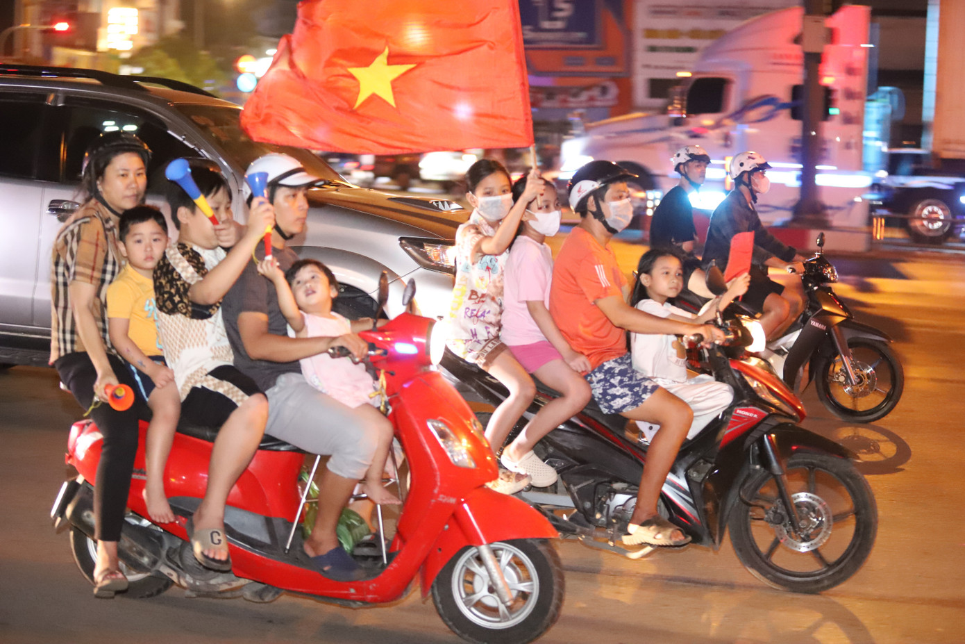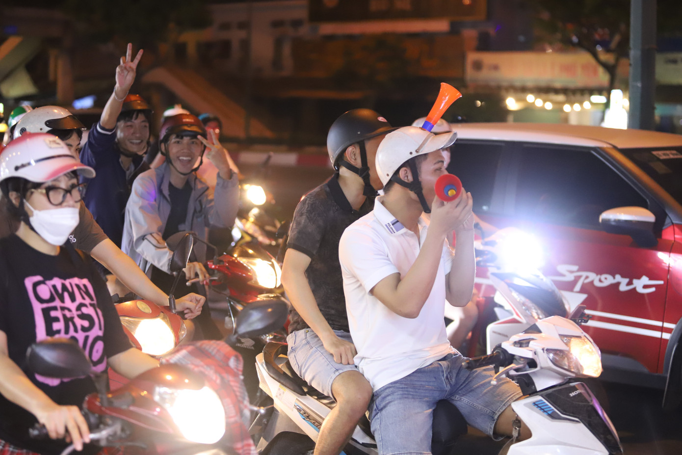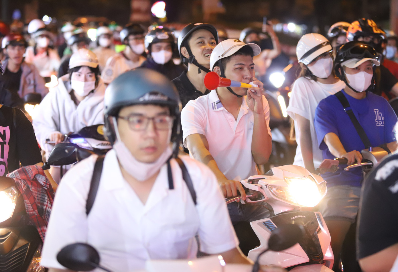 Trong không khí nô nức, háo hức, người dân tay cầm cờ đỏ sao vàng và huýt còi vang dội hết sức sôi động.