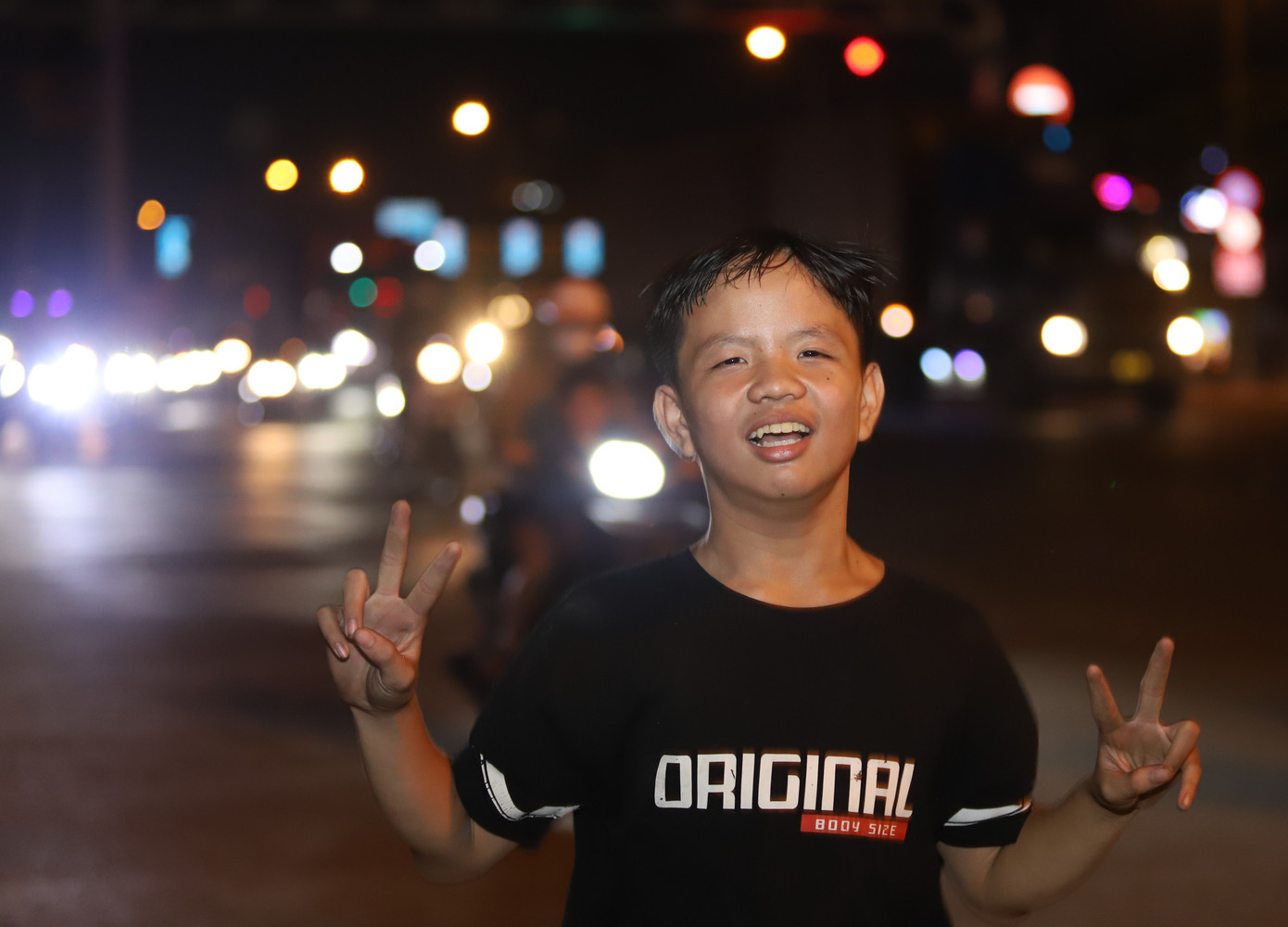 Thấy ống kính phóng viên, cậu bé Tuấn Kiệt (12 tuổi) nhảy cẫng lên vui sướng sau khi ngỏ lời nhờ phóng viên chụp tấm ảnh hòa chung khí thế sôi nổi của dòng người "đi bão".