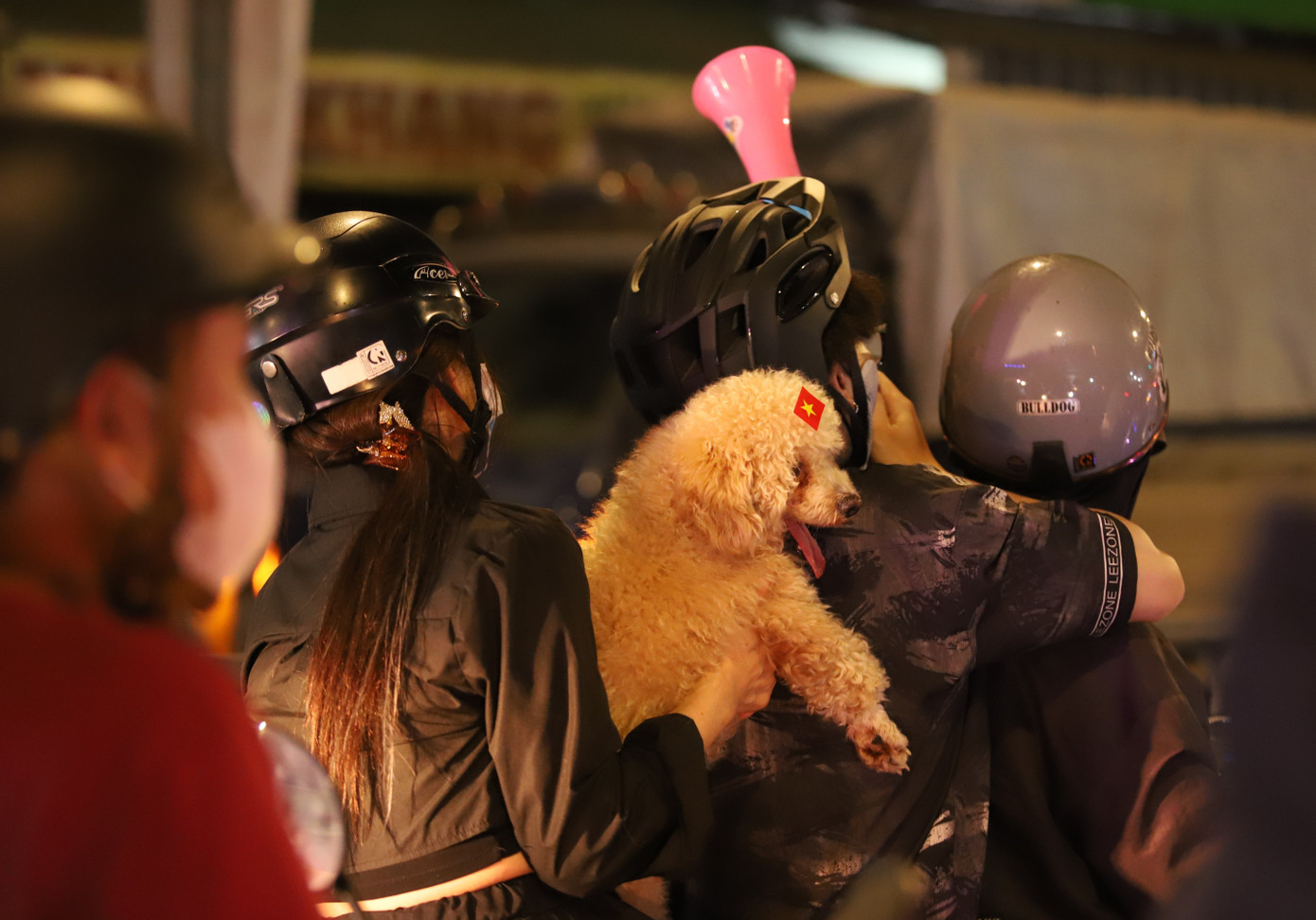 Chủ nhân cùng thú cưng hòa vào không khí sôi nổi trong đêm thắng lợi của đội tuyển.