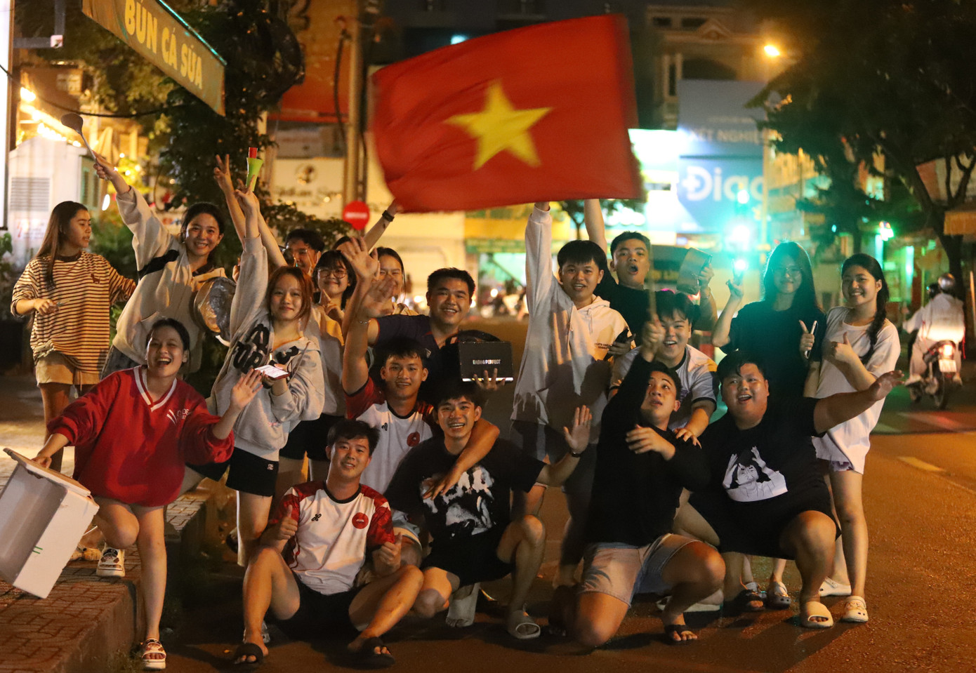 Xuất phát từ đường Phan Văn Trị, nhóm bạn trẻ rủ nhau mang theo cờ Tổ quốc và nhiều "đạo cụ" và rảo bộ đi ăn mừng chiến thắng của đội tuyển bóng đá nước nhà.