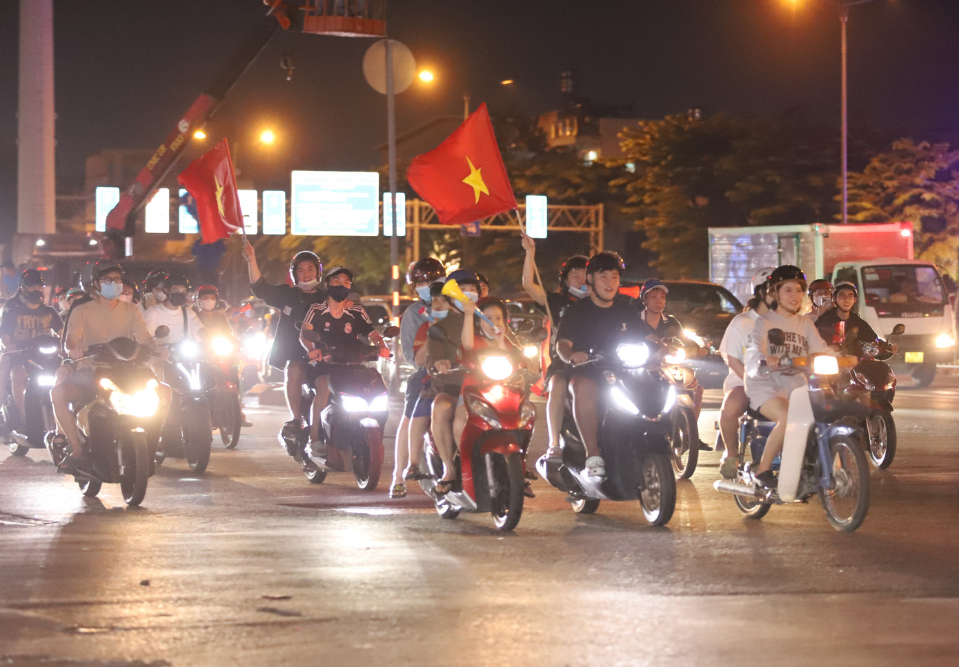 Ghi nhận của Tiền Phong lúc 23h, hàng nghìn người dân, nhất là các bạn trẻ nô nức đổ về tuyến đường Phạm Văn Đồng hòa vào dòng người "đi bão" mừng chiến thắng quan trọng của đội tuyển. Mọi người liên tục hò hét, hô vang "Việt Nam, Việt Nam!"