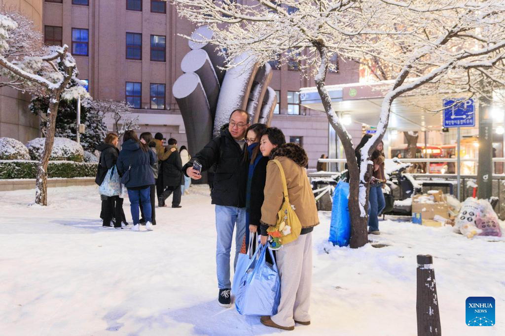 Mọi người chụp ảnh lưu niệm trong trận tuyết rơi đầu mùa ở Seoul ngày 4/12. Ảnh: Xinhua News.