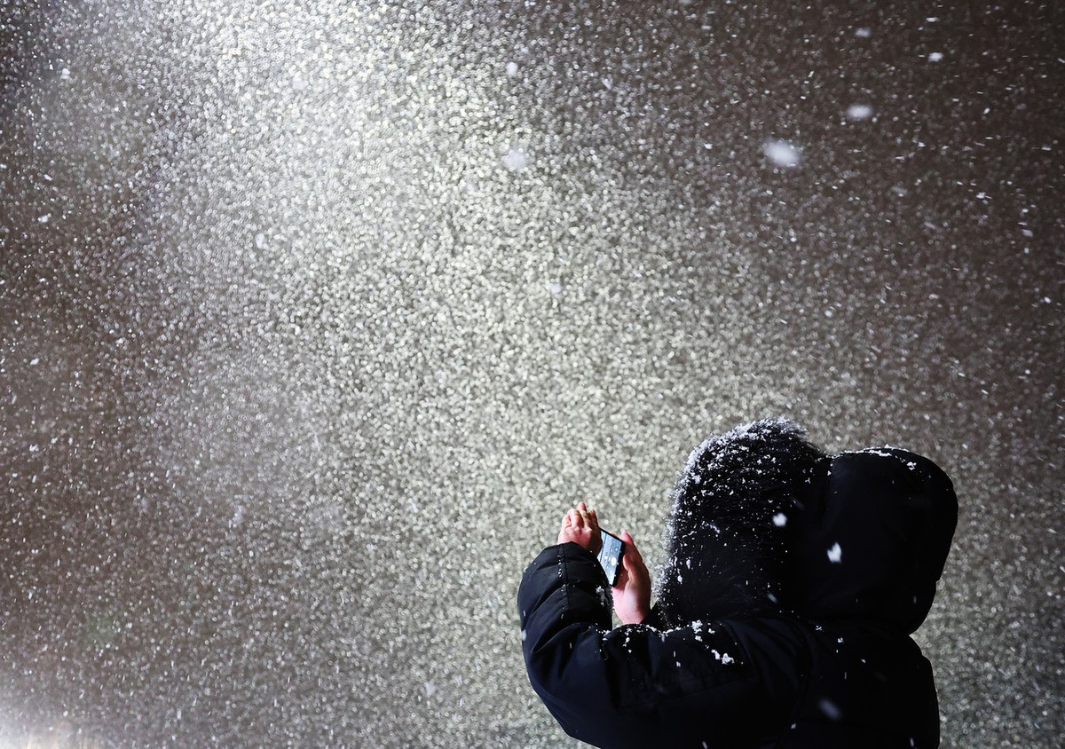 Thành phố Suwon, tỉnh Gyeonggi, cũng đã đón trận tuyết rơi đầu mùa vào ngày 4/12/2025. Ảnh: Một người dân chụp cảnh tuyết rơi ấn tượng ở Suwon. Ảnh: Yonhap.