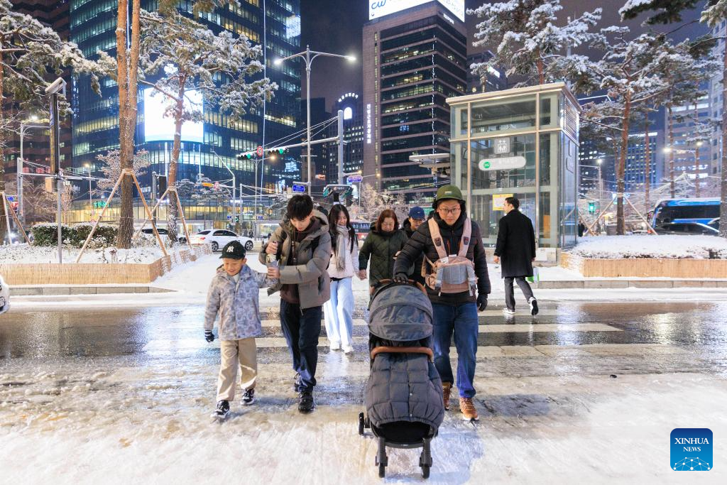 Người dân đi bộ qua con đường phủ đầy tuyết trắng ở Seoul ngày 4/12/2025. Ảnh: Xinhua News.