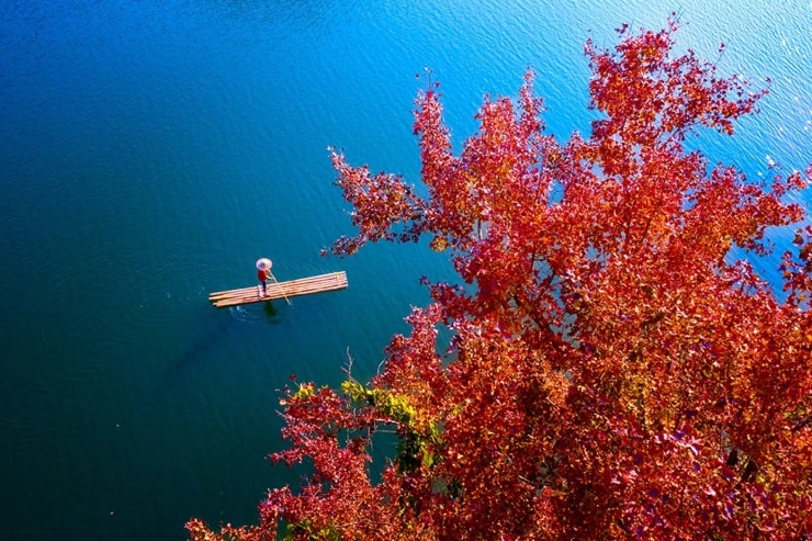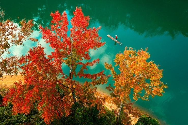 "Tôi thường chụp lại cảnh sắc tại hồ Bản Viết mỗi độ đông về như để ngưng đọng lại thời gian đẹp nhất lúc giao mùa", anh Dương tâm sự. Sắc đỏ của lá cây hòa cùng màu xanh của nước và núi rừng tạo nên một khung cảnh có chiều sâu, gợi nhắc đến những thước phim lãng mạn của Hàn Quốc hay các nước ôn đới.