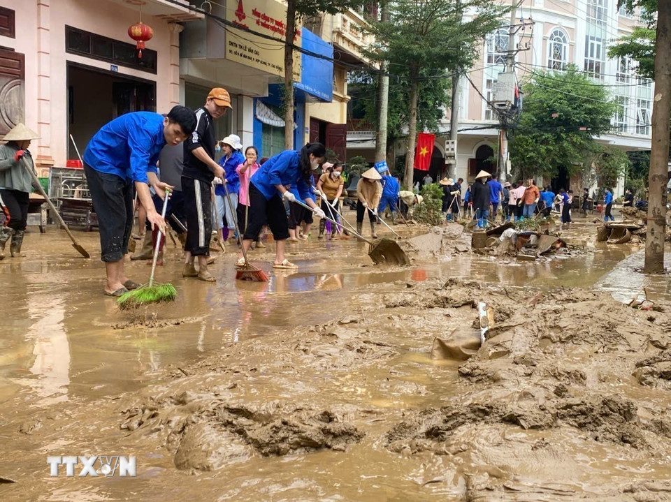 Các lực lượng thanh niên tình nguyện được huy động để giúp dân dọn dẹp nhà ở, vệ sinh đường phố. (Ảnh: TTXVN)
