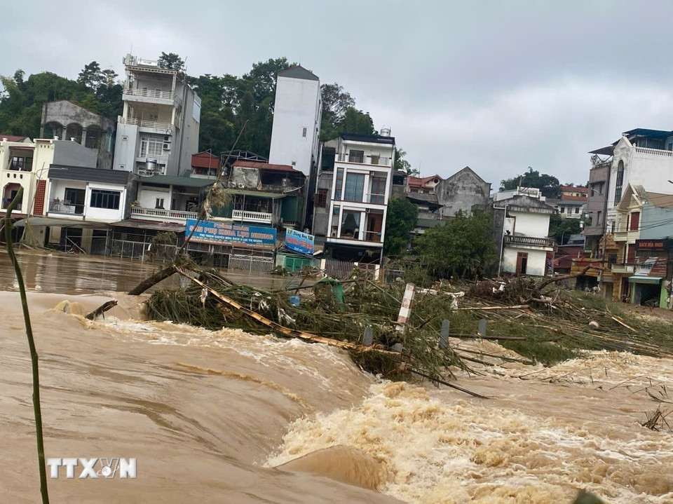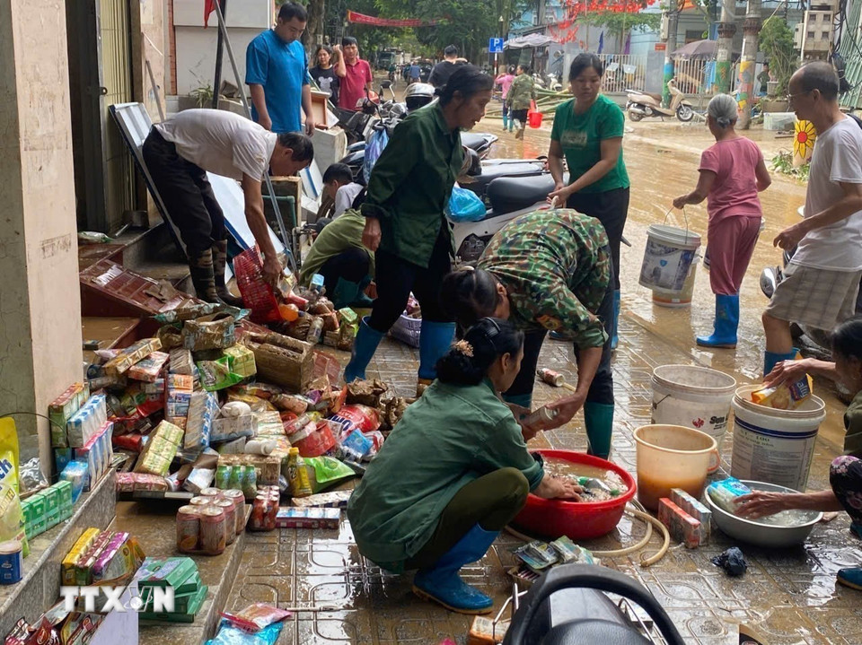 Người dân dọn rửa lại cửa hàng tạp hóa bị ngập nước tại Cao Bằng. (Ảnh: TTXVN)