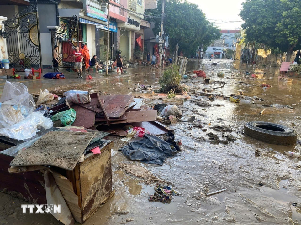 Nước rút để lại khối lượng bùn đất, rác thải khổng lồ khiến cho công tác vệ sinh môi trường gặp nhiều khó khăn. (Ảnh: TTXVN)