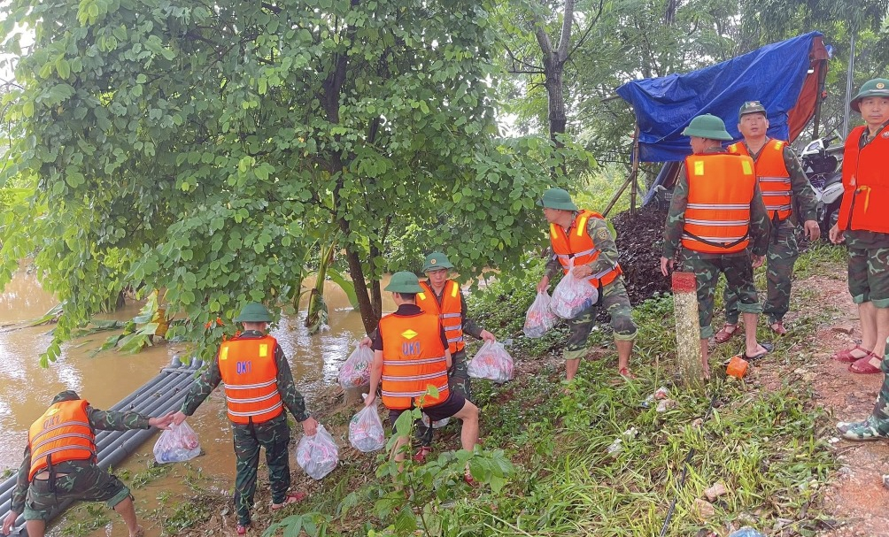 Cán bộ, chiến sỹ Bộ chỉ huy Quân sự tỉnh vận chuyển nhu yếu phẩm đến vùng bị cô lập tại xã Hòa An.