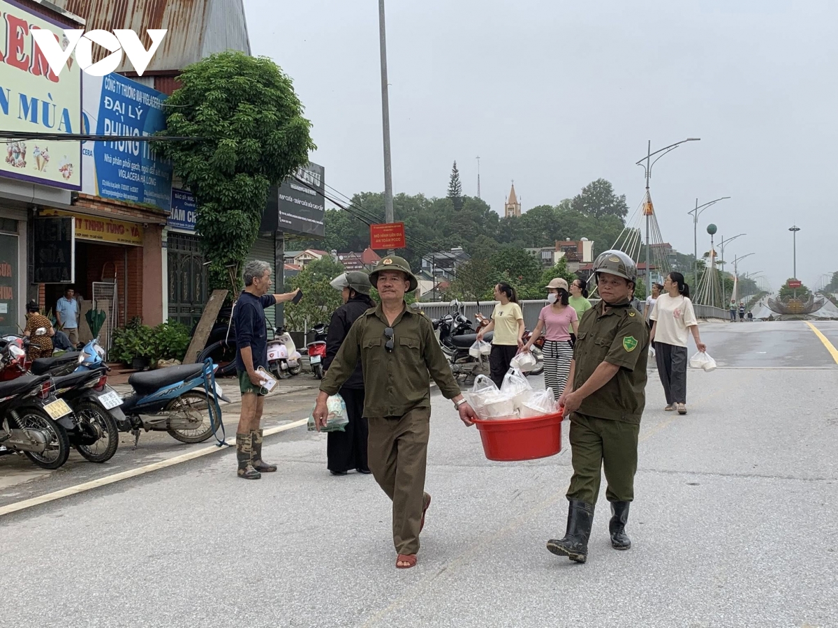 Lực lượng chức năng phường Thục Phán, tỉnh Cao Bằng hỗ trợ các suất ăn miễn phí cho người dân bị nước lũ cô lập do giao thông chia cắt