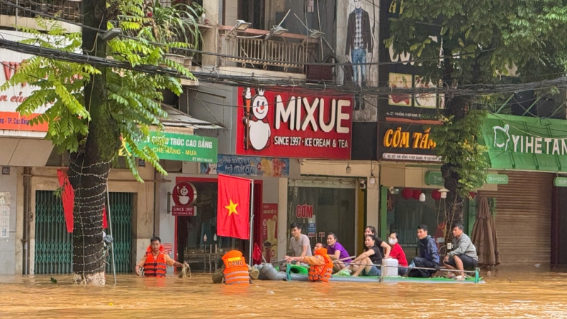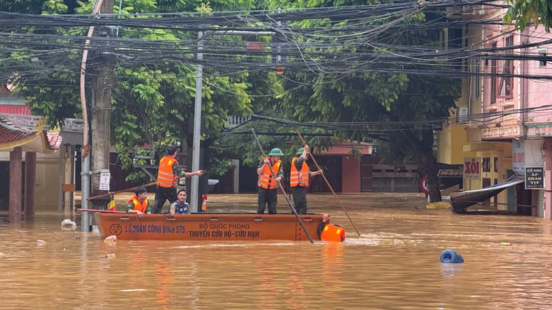 Lực lượng cứu hộ có mặt kịp thời tại các điểm ngập lụt hỗ trợ người dân.